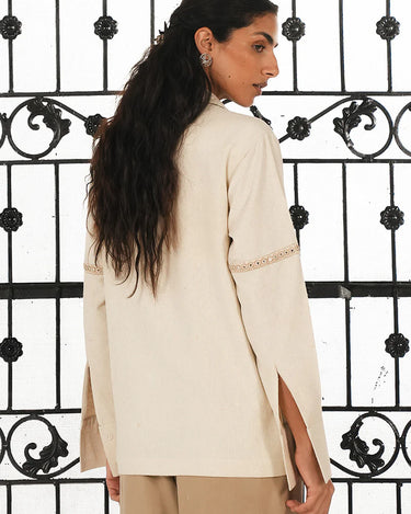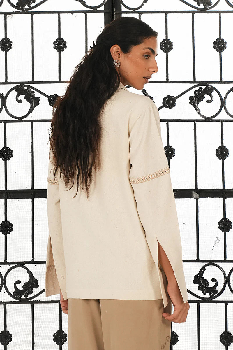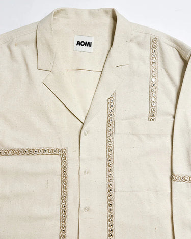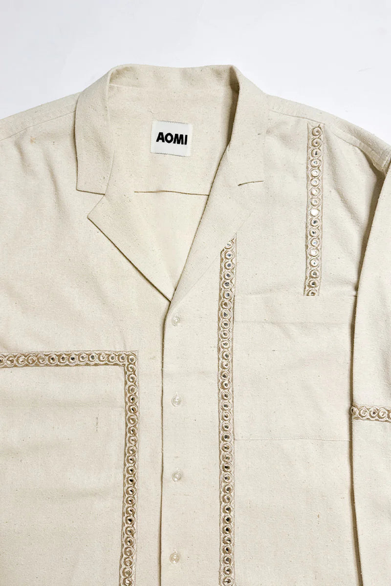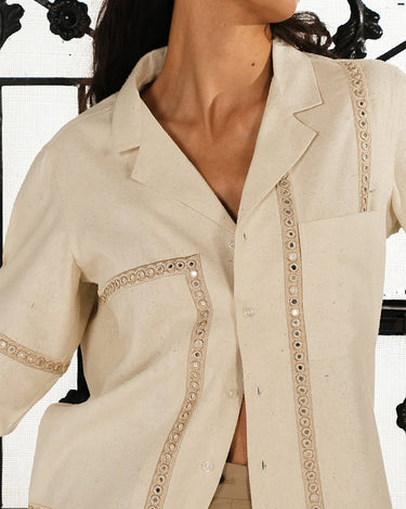 Relaxed, resort shirt accentuated with handcrafted, monotone mirror-work detailed with a notch collar.