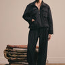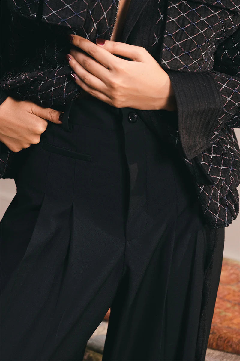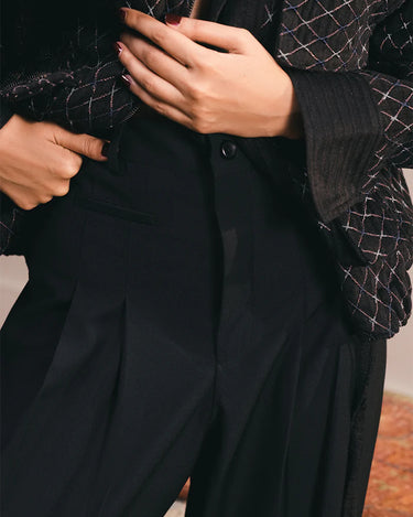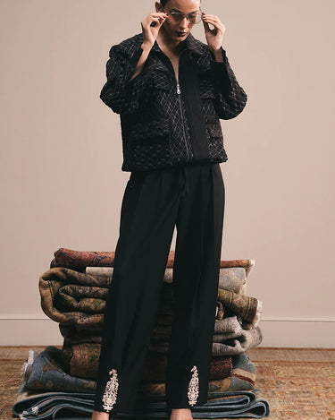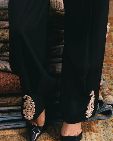 A tapered shalwar-trouser defined by soft waist pleats and box pleating at the hem. Hand-drawn and hand-embroidered motifs in contrasting cream trace the lower panels, blending ease of form with artisanal detail.