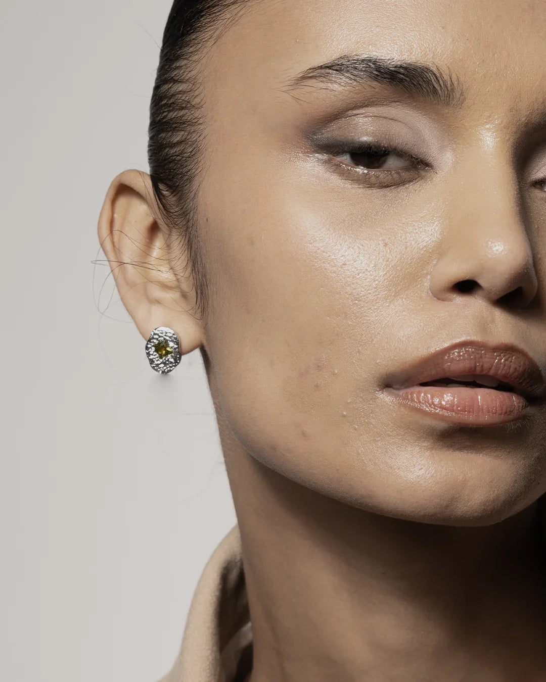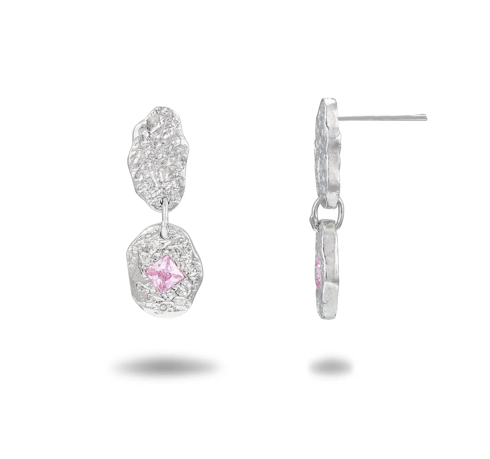 The Drops Stellar Pink Earrings feature two, hand engraved textured silver drops embedded with a single pink stone.
