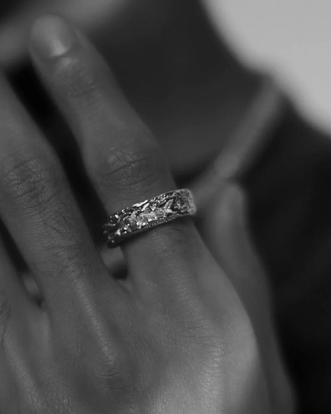 The Iron Maiden Ring is a circular band inspired by the raw energy of metallic and hard rock music. Its imperfect design pays homage to the spirit of heavy metal band, Iron Maiden.
