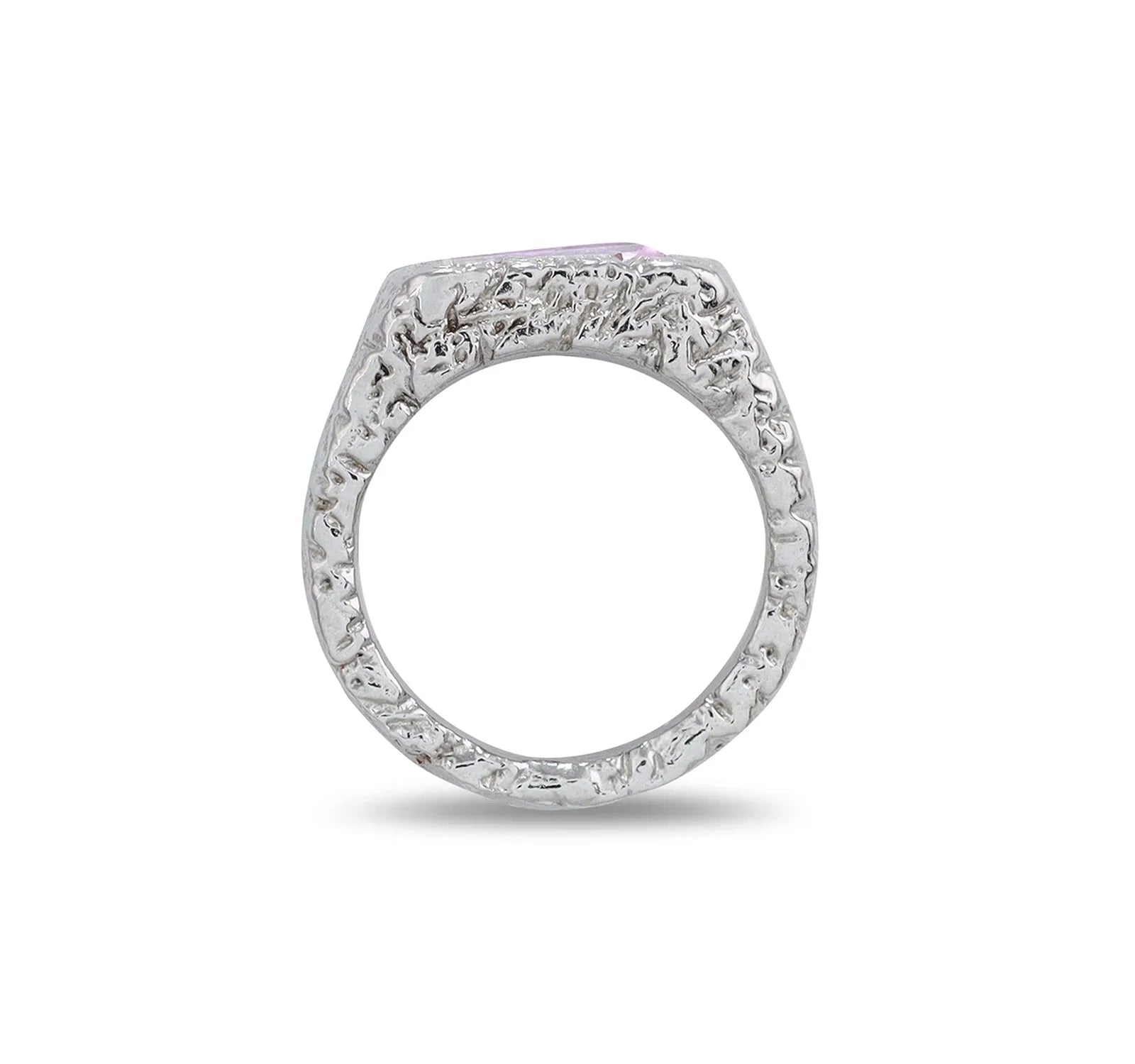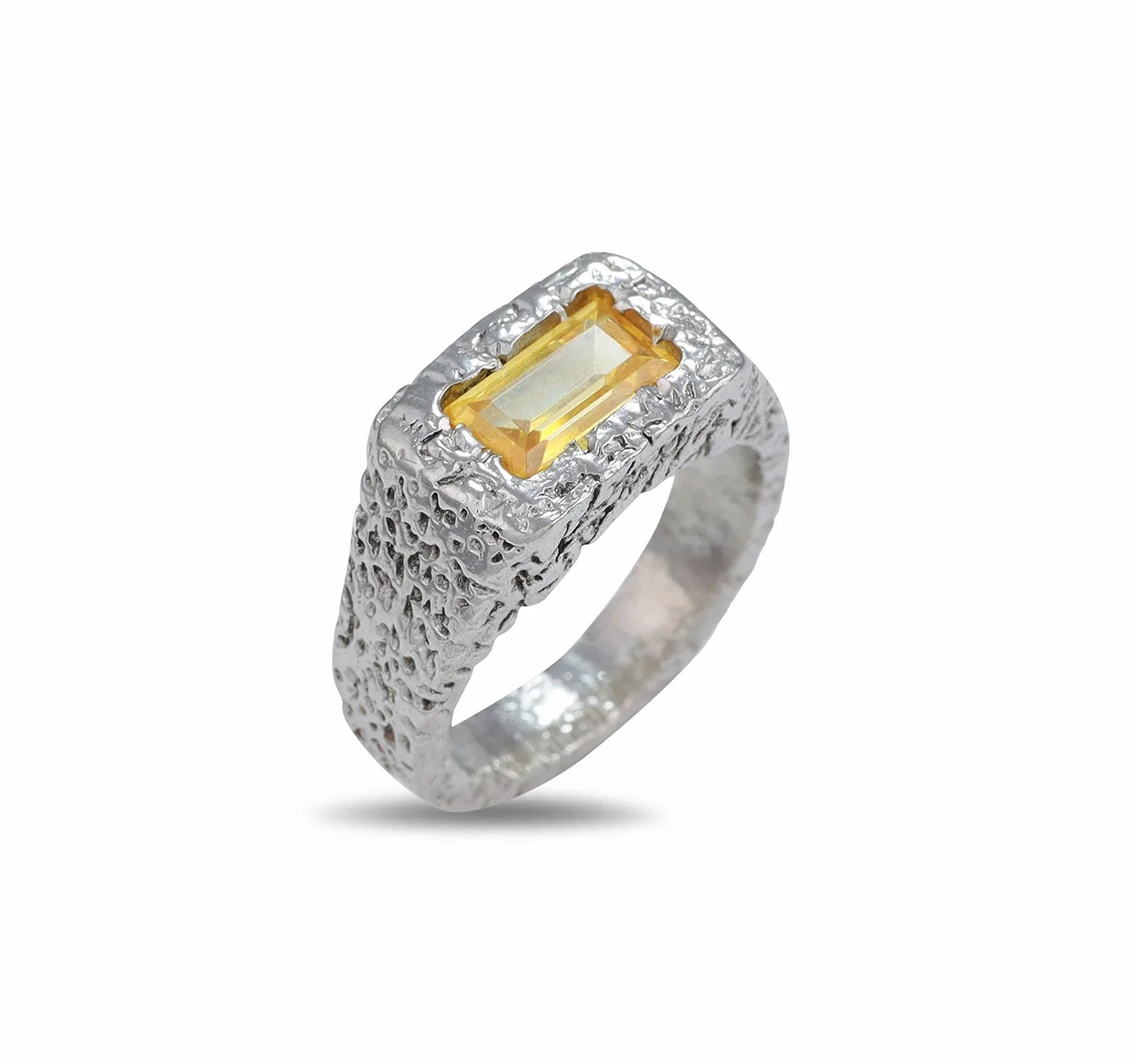 The Lone Jewel Yellow Ring features a bold rectangular stone embedded within a raw textured, silver surface. A modern take on a signet ring.