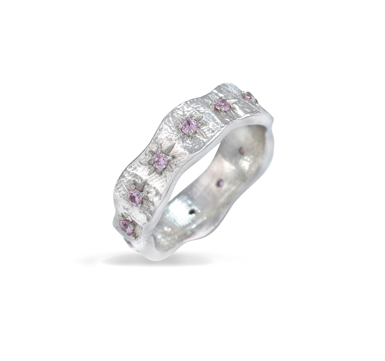 The Pink Celestial Ring, an ode to the glimmer of the galaxy, is adorned with stones that sit within star-shaped engravings, etched around the circumference of the band.