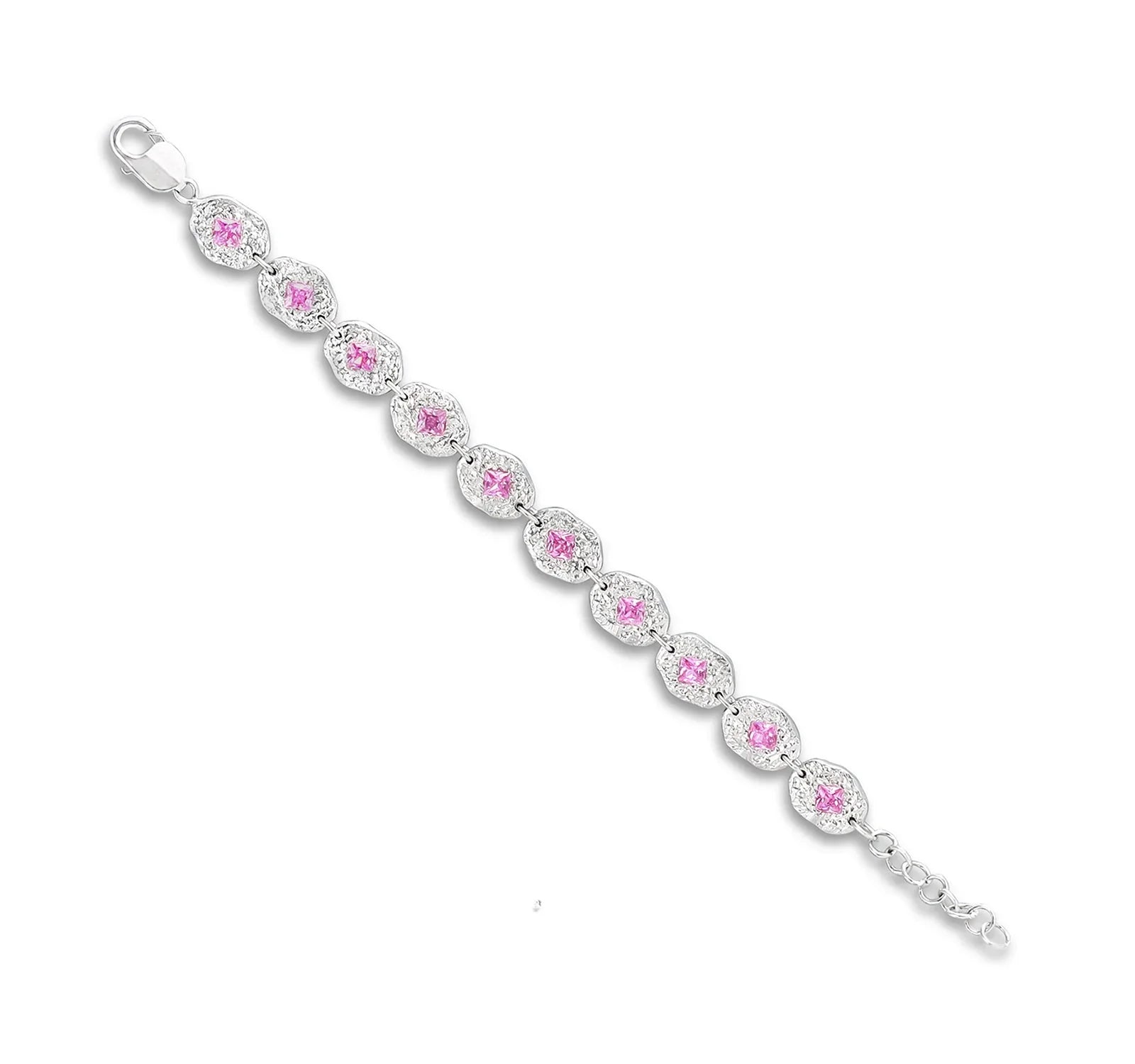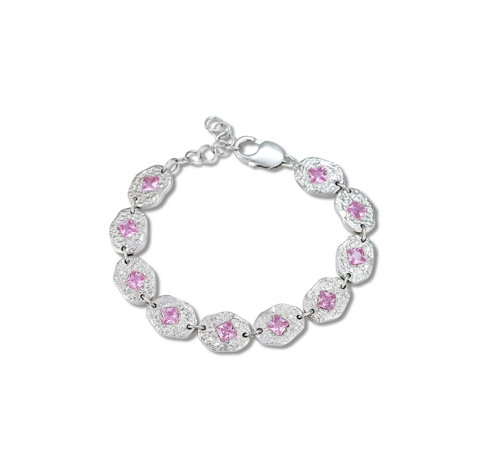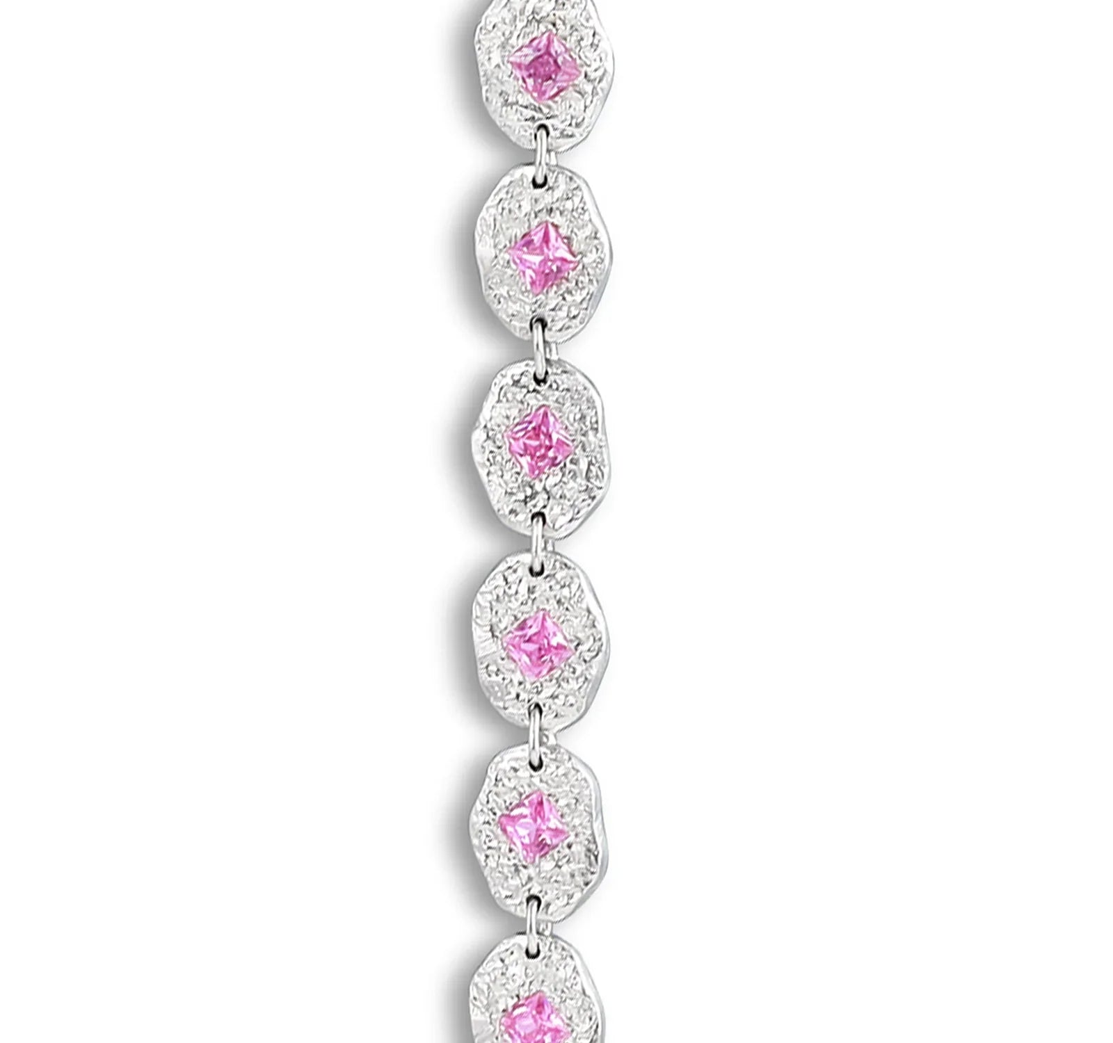 The Stellar Pink Bracelet, a band-like chain designed in 925 silver with a seamless pattern of interlocking eye-shaped ovals, each embedded with pink stones. Raw, textured, and timeless.