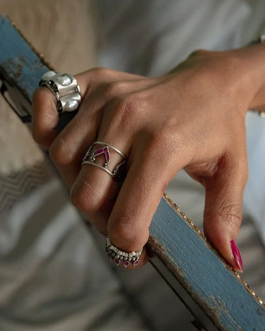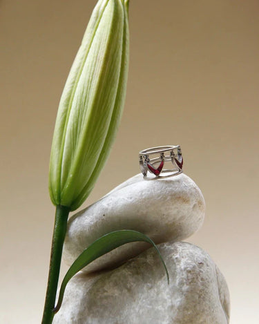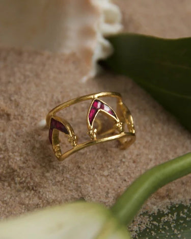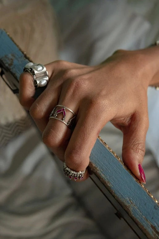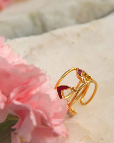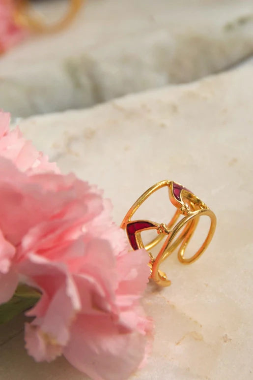 Bold as Love Ring; a striking arrangement of V-shaped Kundan stones forming a bold and unique design that symbolizes the passionate and intense nature of love. The vibrant colors and masterful use of Rawa enhance its sophistication, while the adjustable fit ensures comfort for any finger.