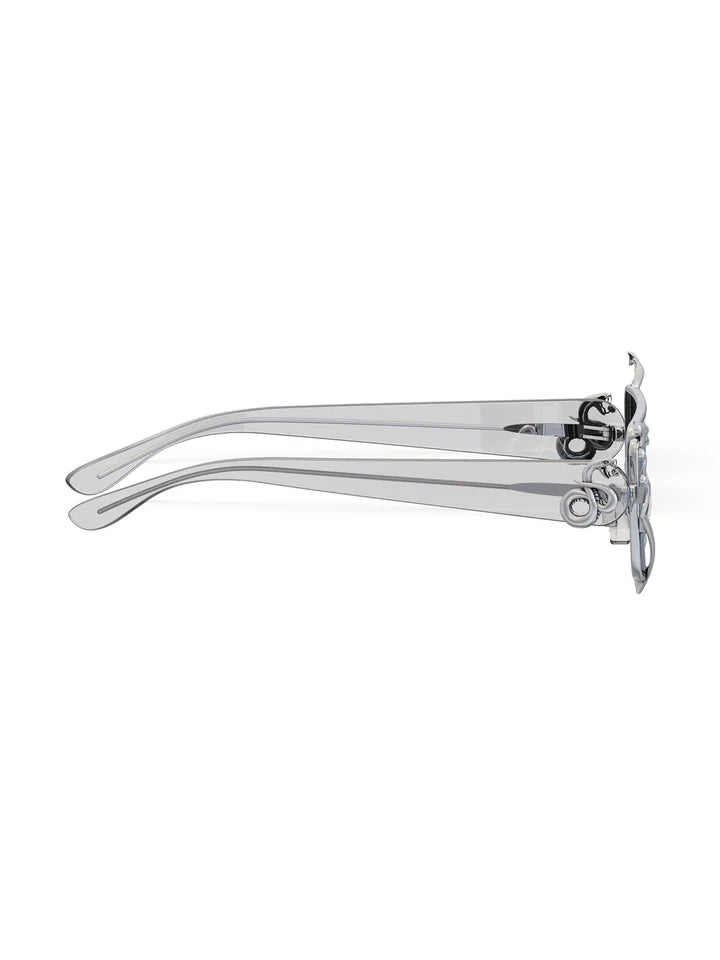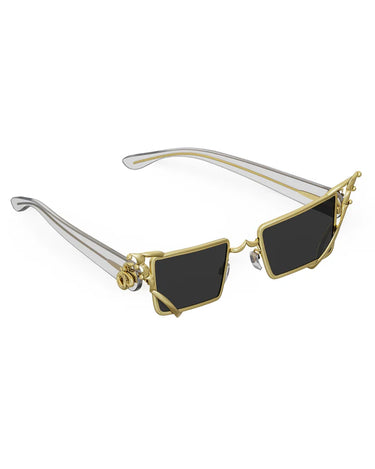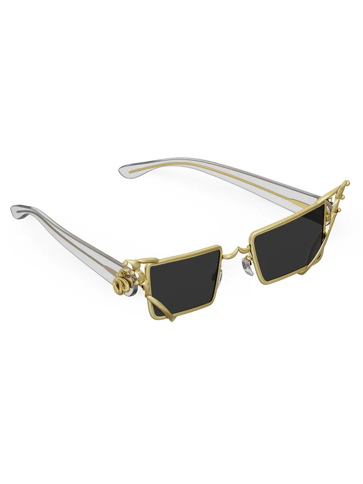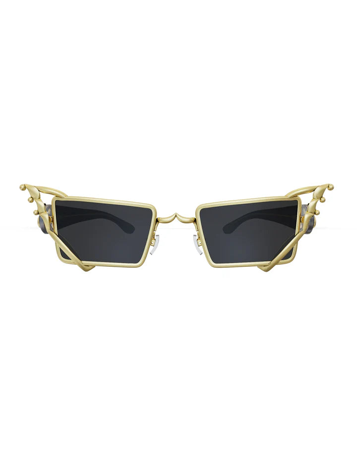 Paabi Sunglasses; hand-made designer rectangular frame sunglasses by Bhavya Ramesh Jewelry, with metal detailing accentuating their cat-eye shape. Bold, stylish, and effortlessly cool, these statement sunglasses add a quirky designer touch to any look.