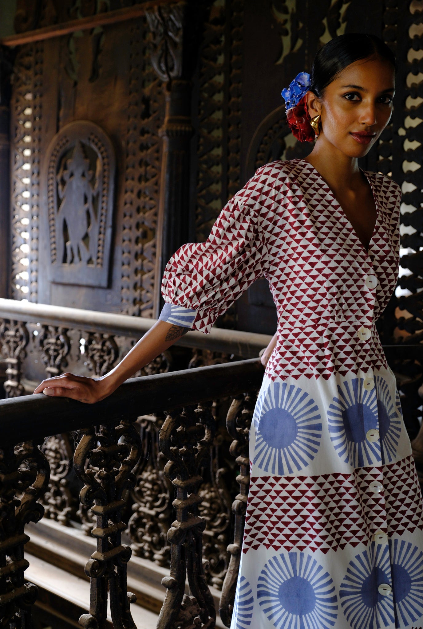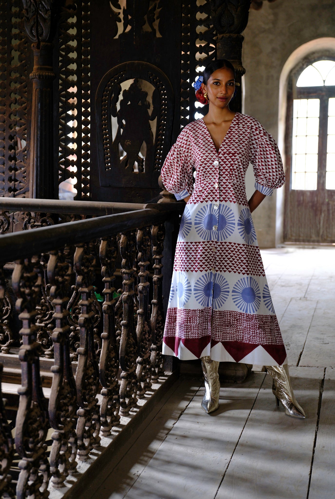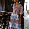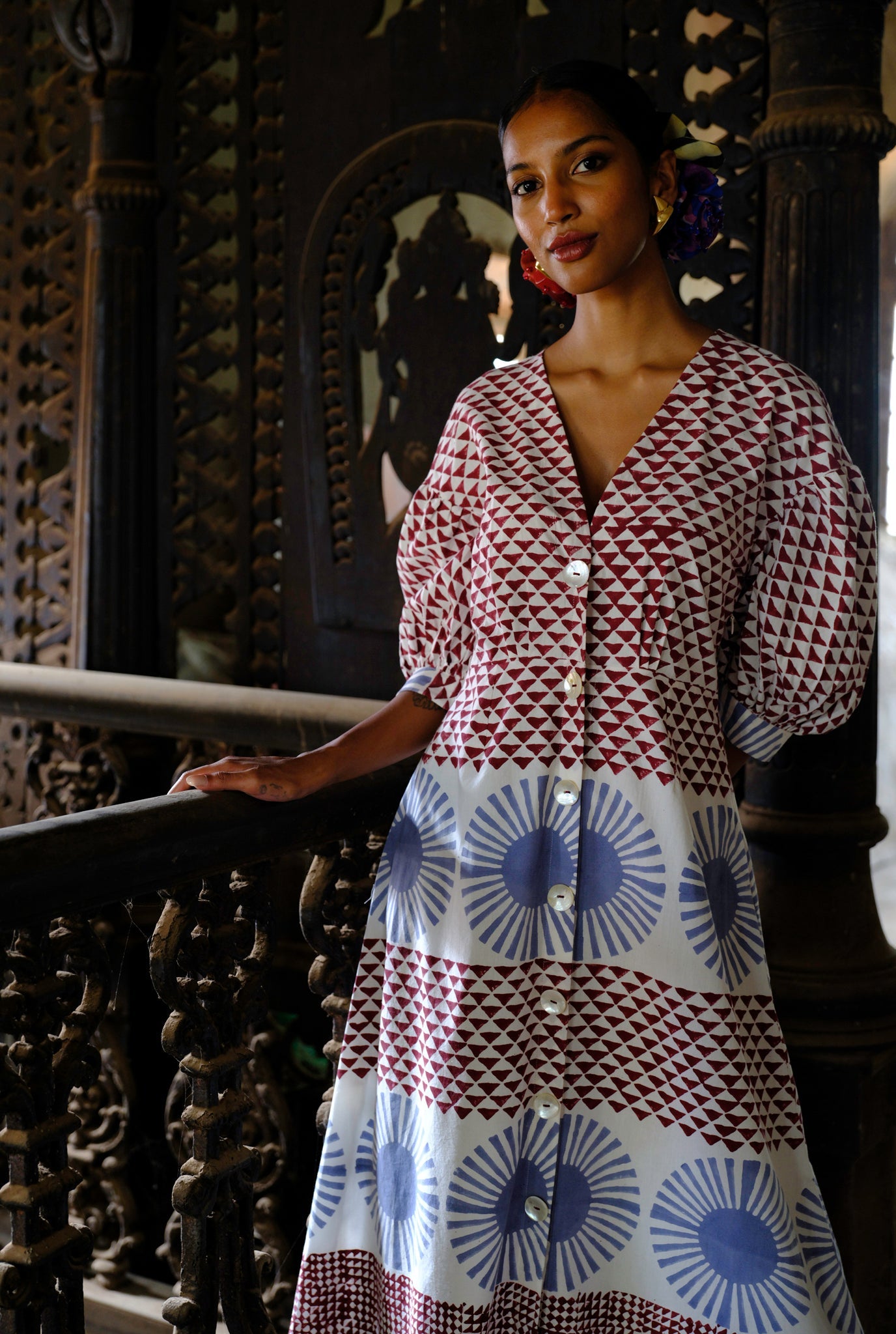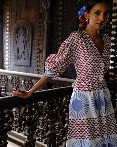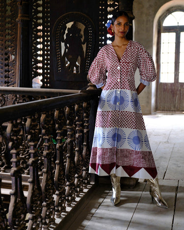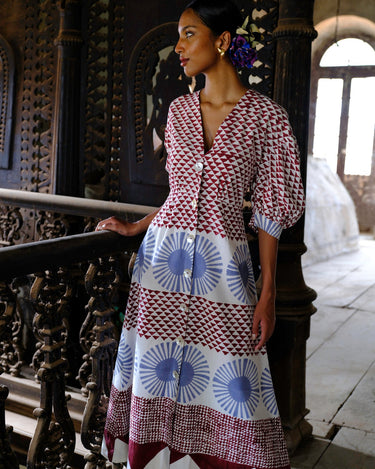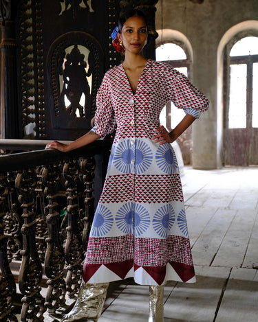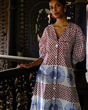 A bold hand-block print on a feminine silhouette, this dress features billowy sleeves and a flattering neckline.
