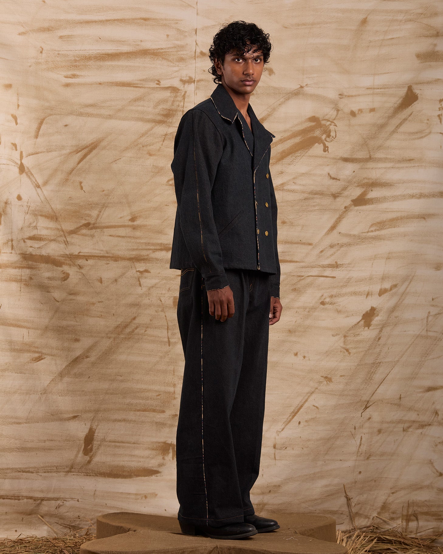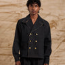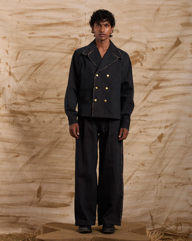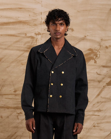 Structured denim double-breasted jacket.