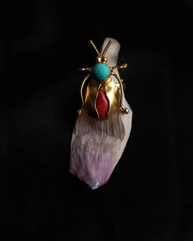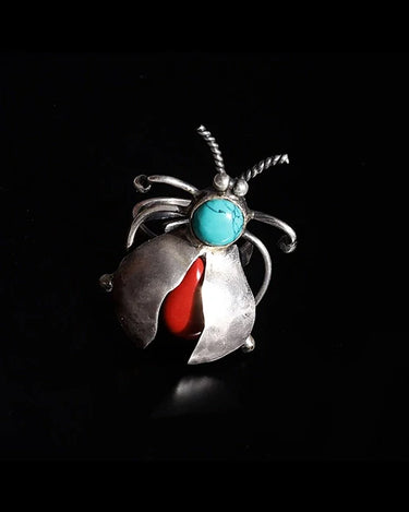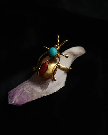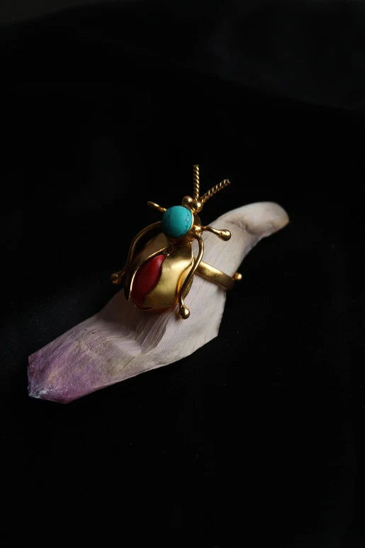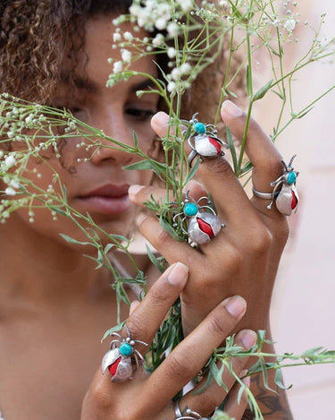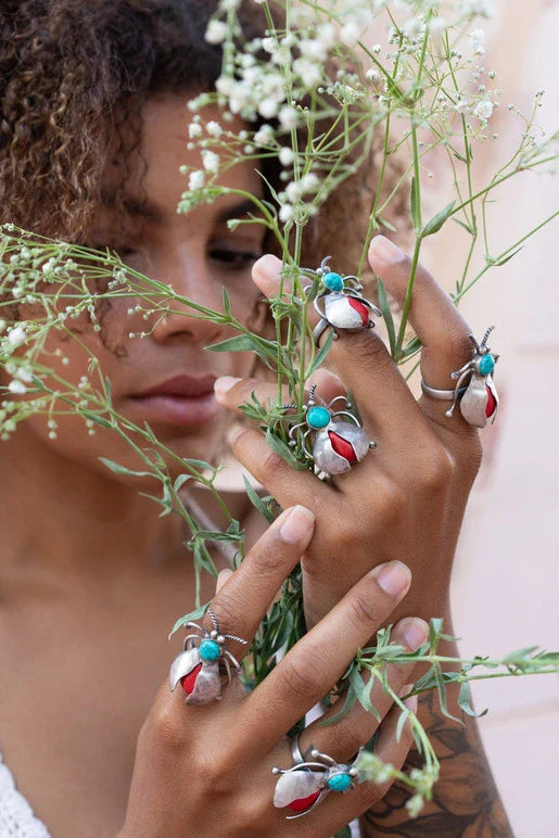 Bug Ring; an insect-inspired ring that exudes quirky and playful charm. Featuring turquoise and semi-precious coral stones, this whimsical design celebrates the wonders of nature while adding a vibrant, captivating touch to any ensemble.