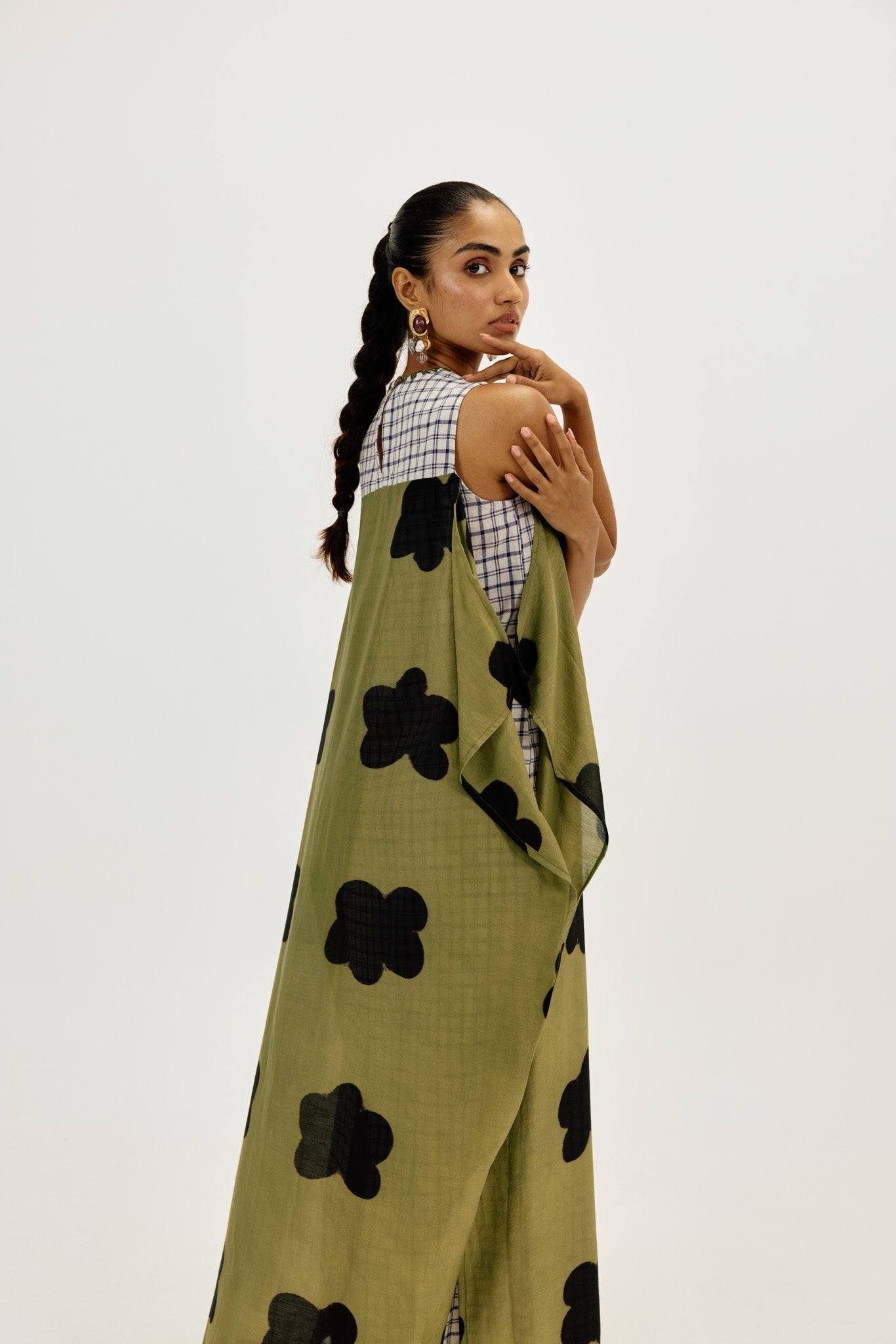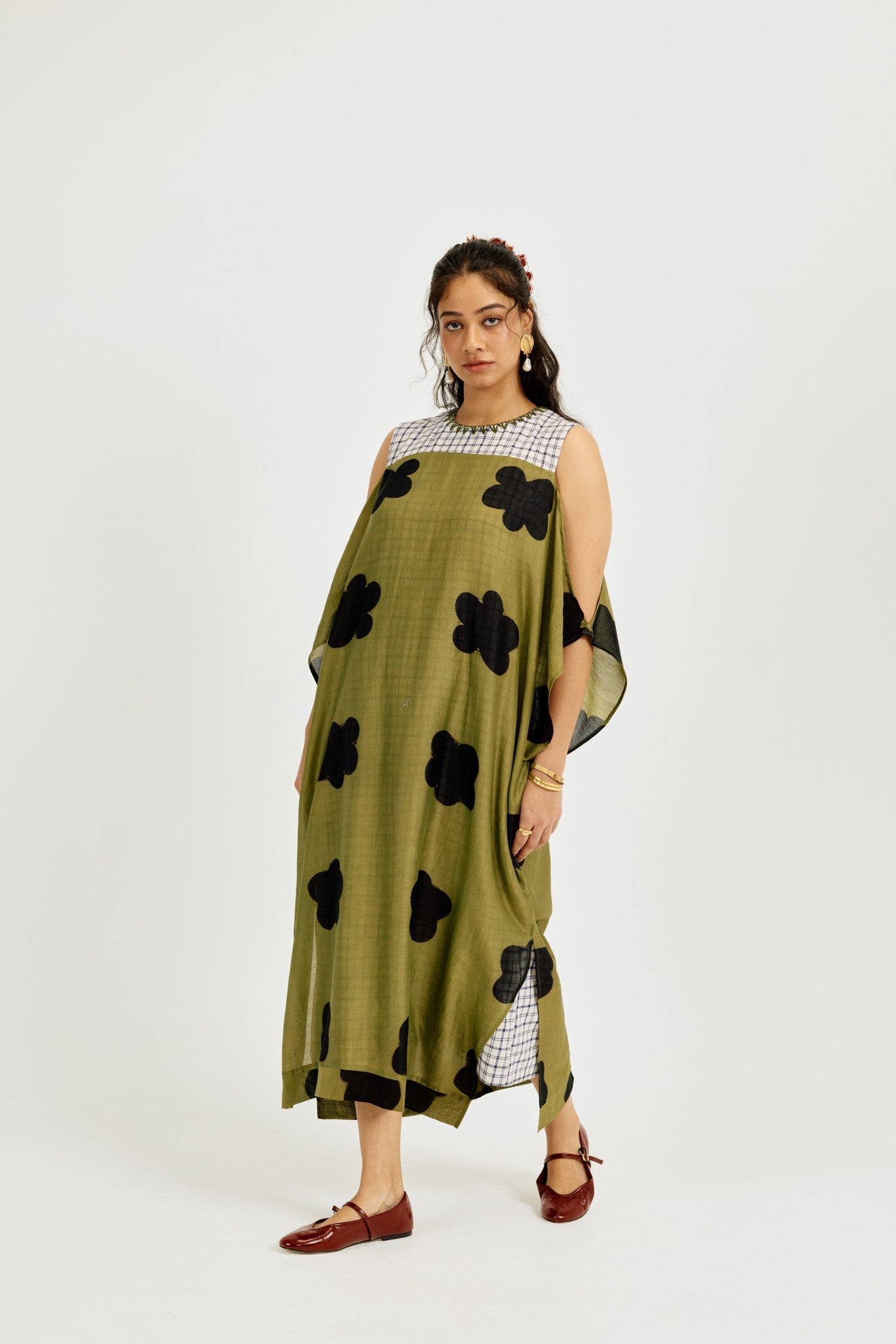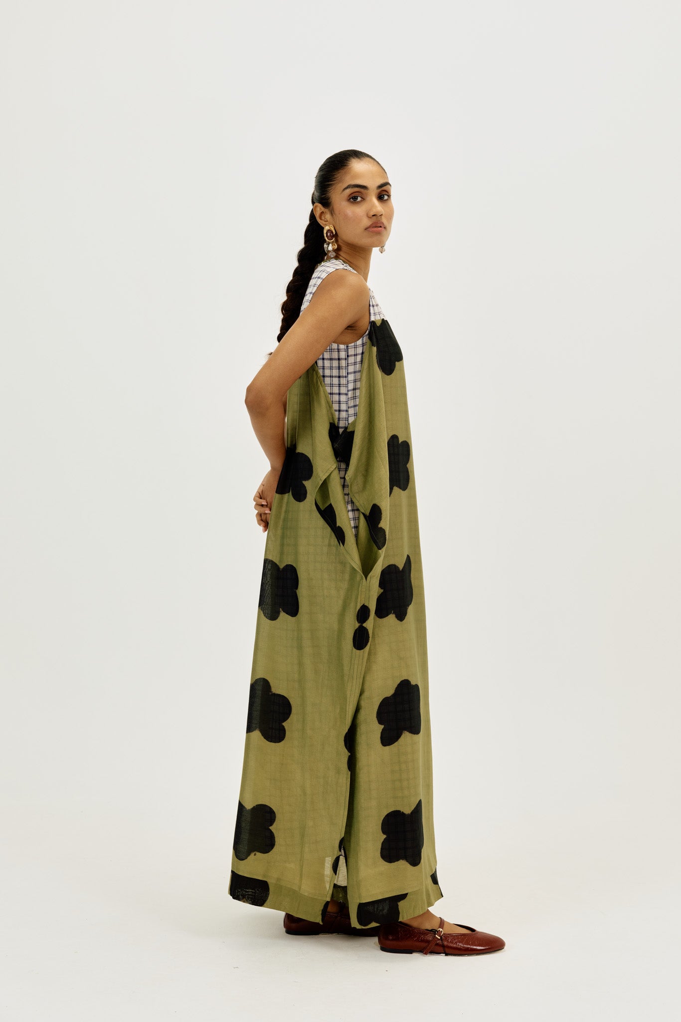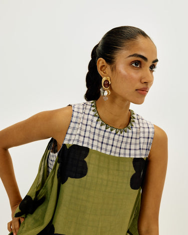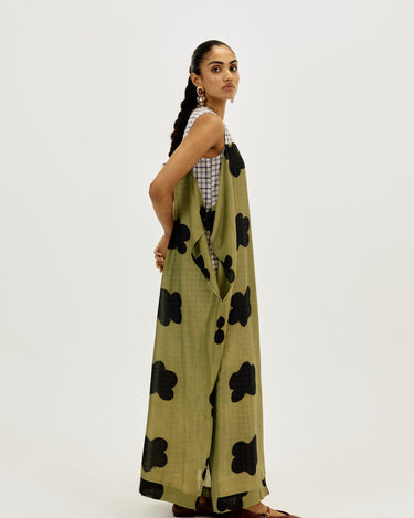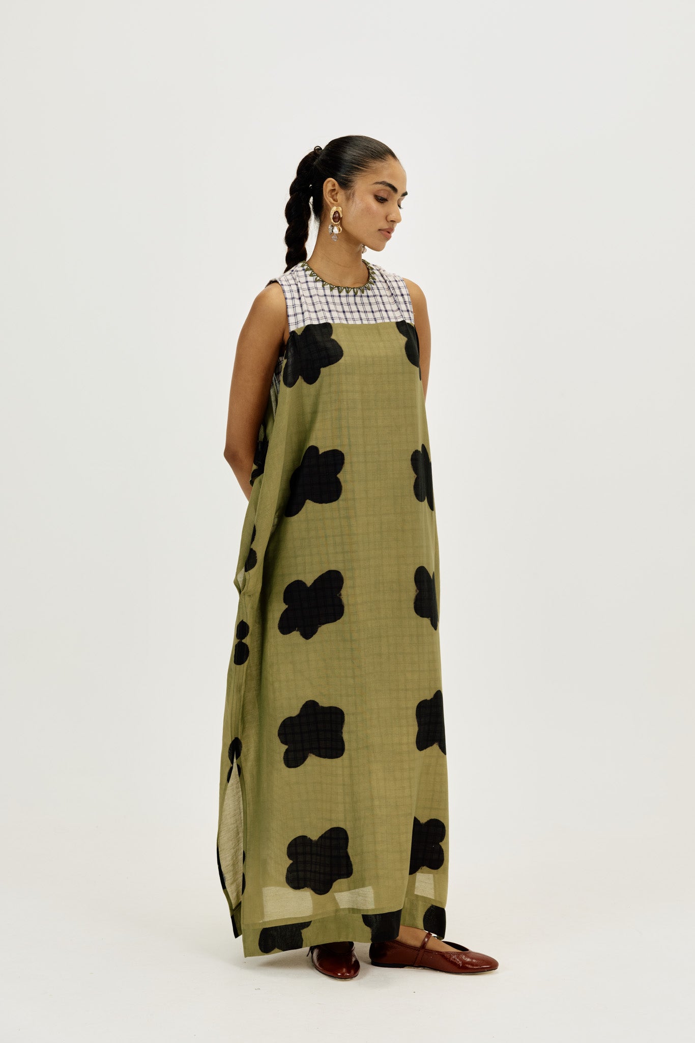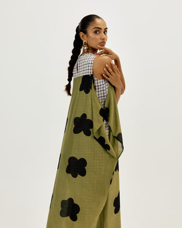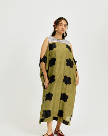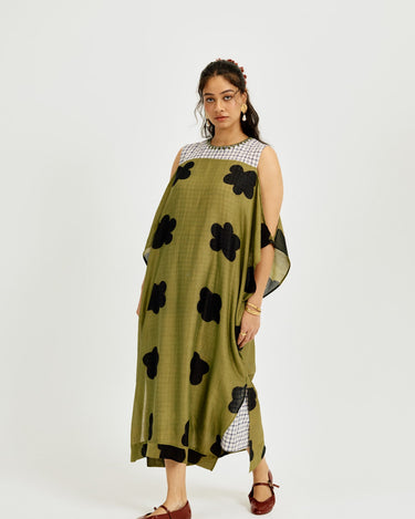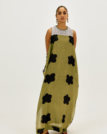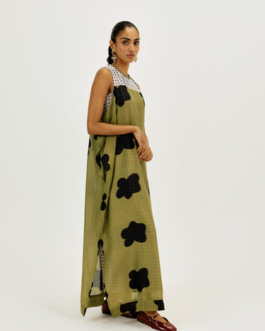 A statement piece that feels as comfortable as it looks striking. This relaxed-fit maxi dress is crafted in airy clamp-dyed Chanderi, with a contrast full checkered lining that adds playful structure to the flowy silhouette.