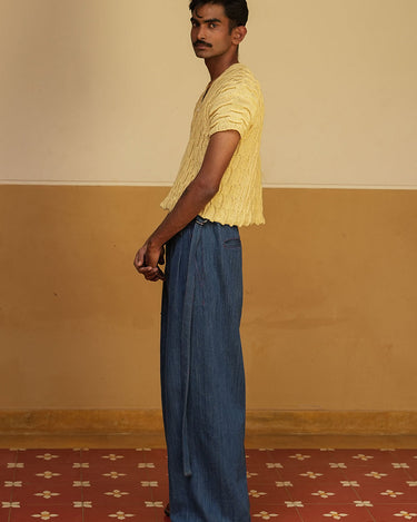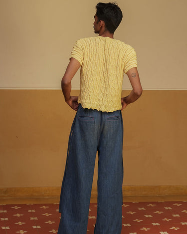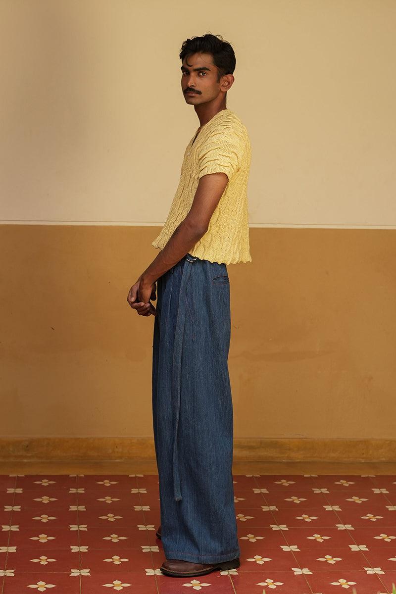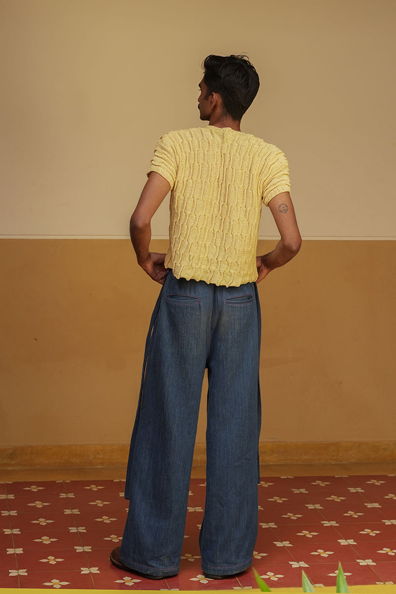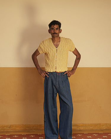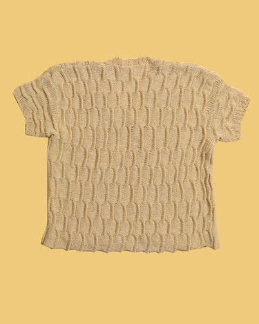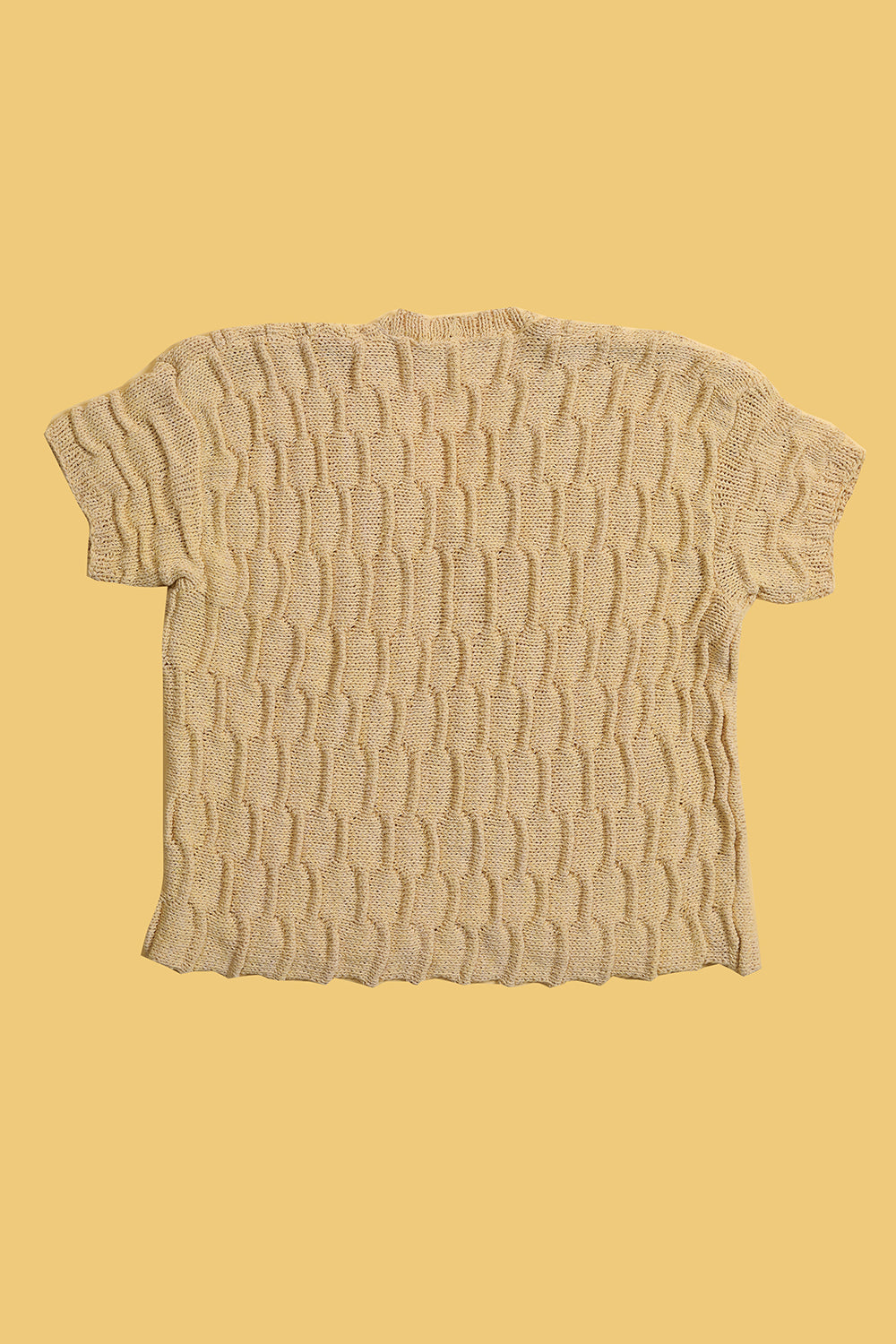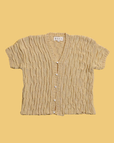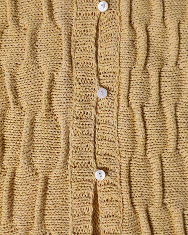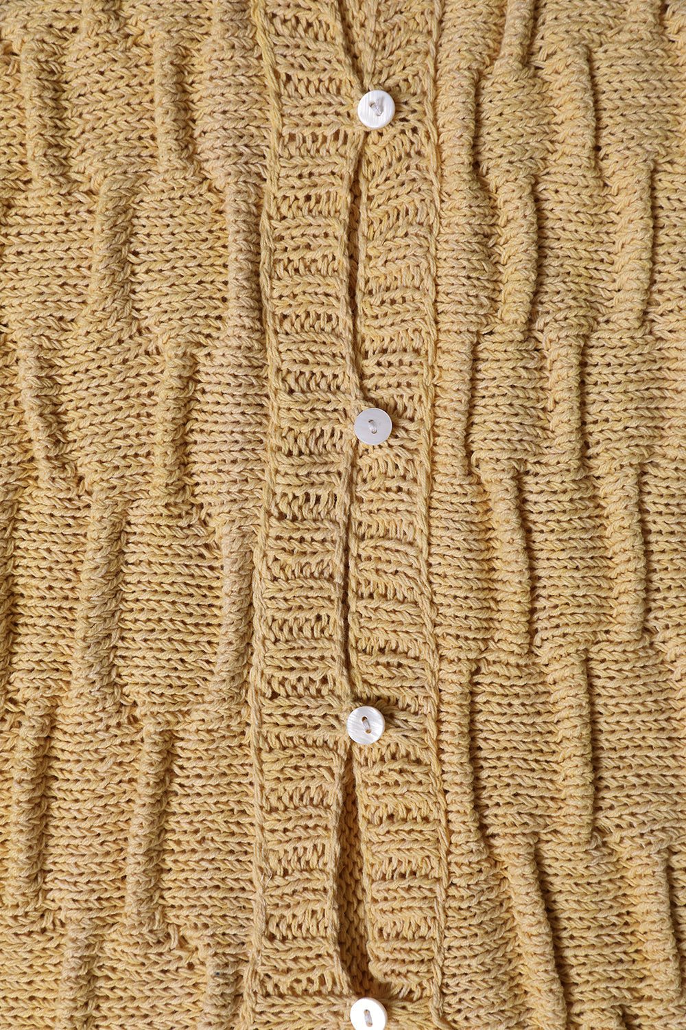 Abstract Bubble cardigan is hand knitted using 100% organic cotton and hand dyed with natural dye(jackfruit). Regular fit with mother of pearl buttons.