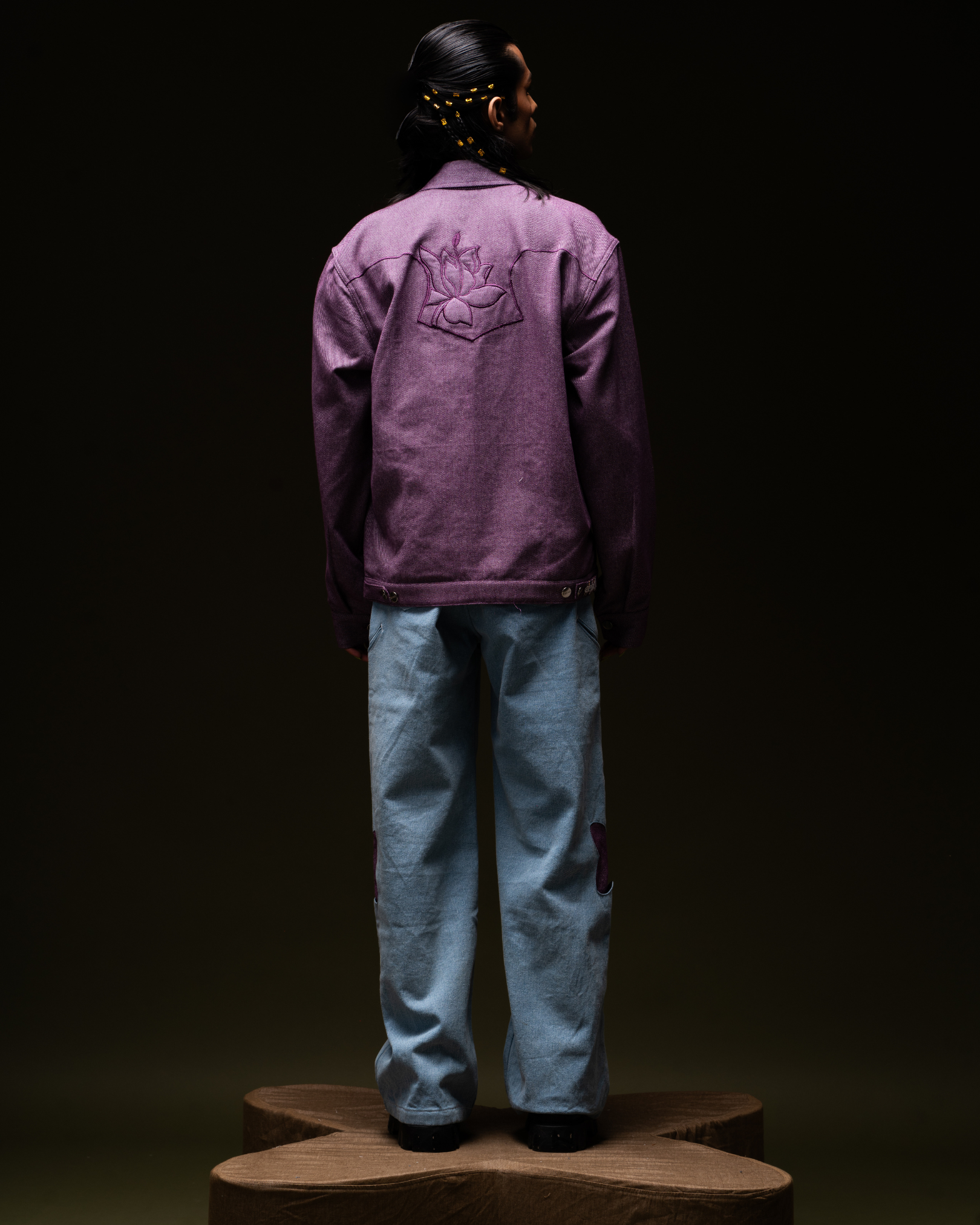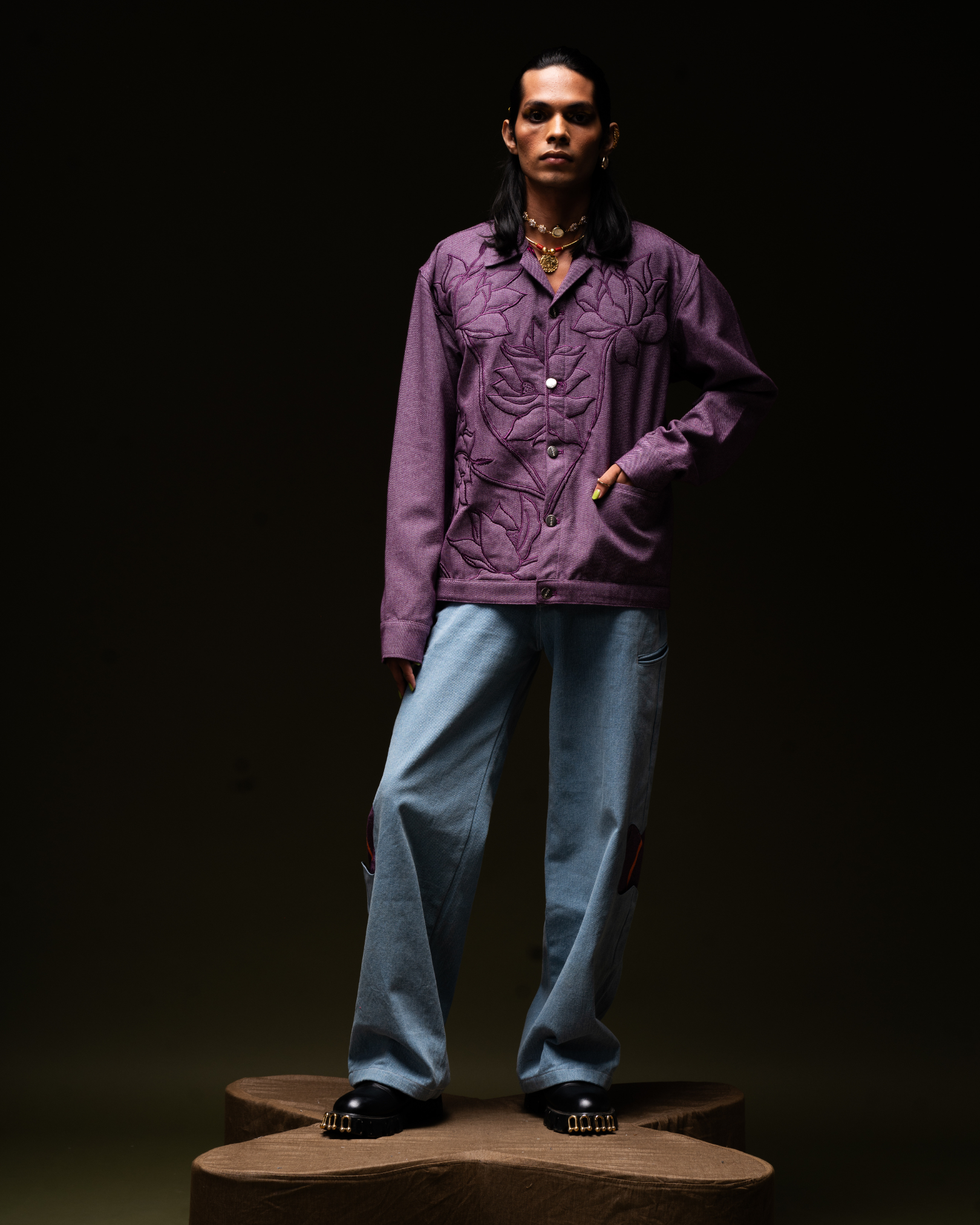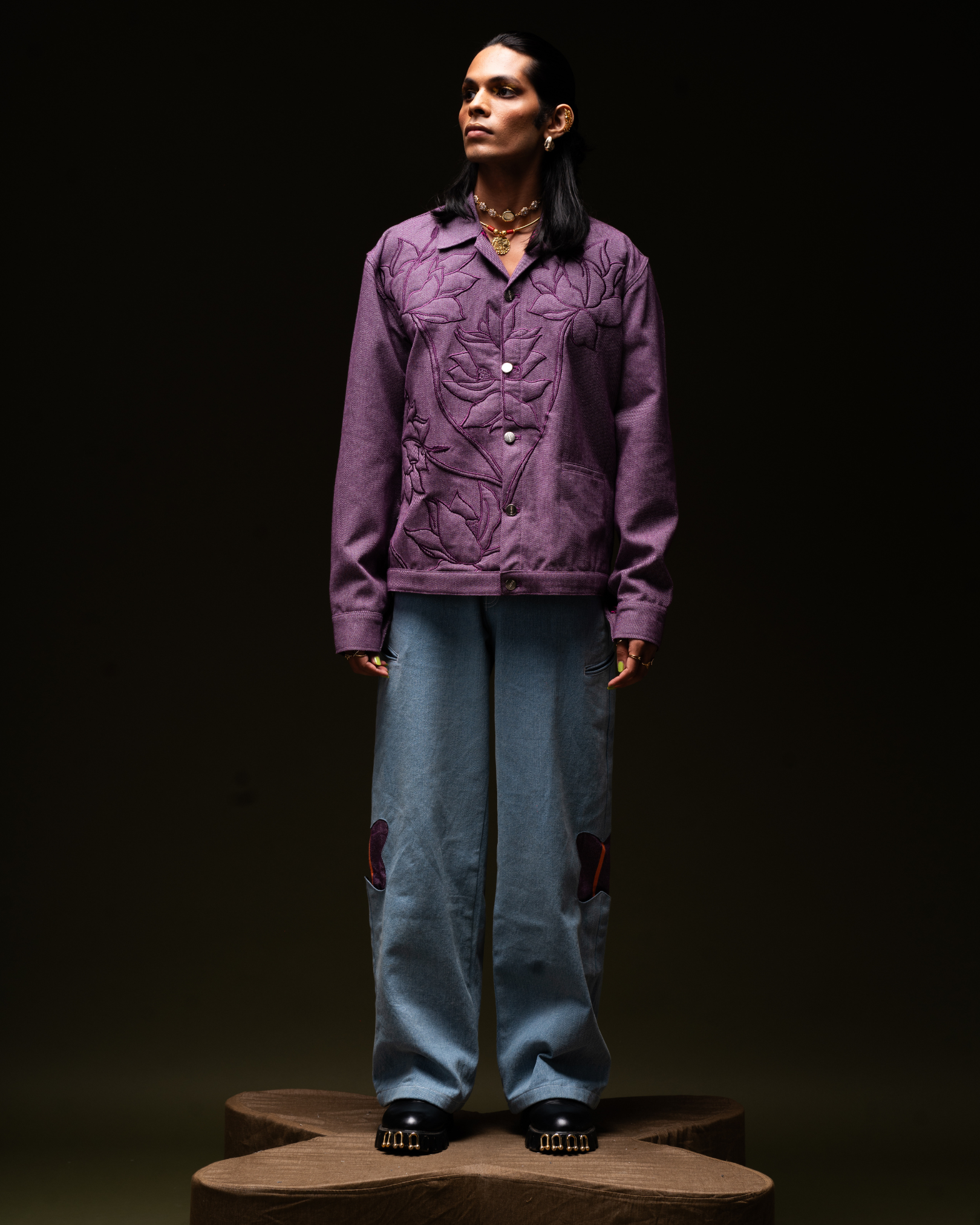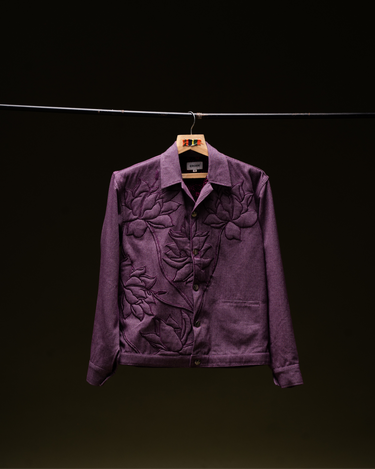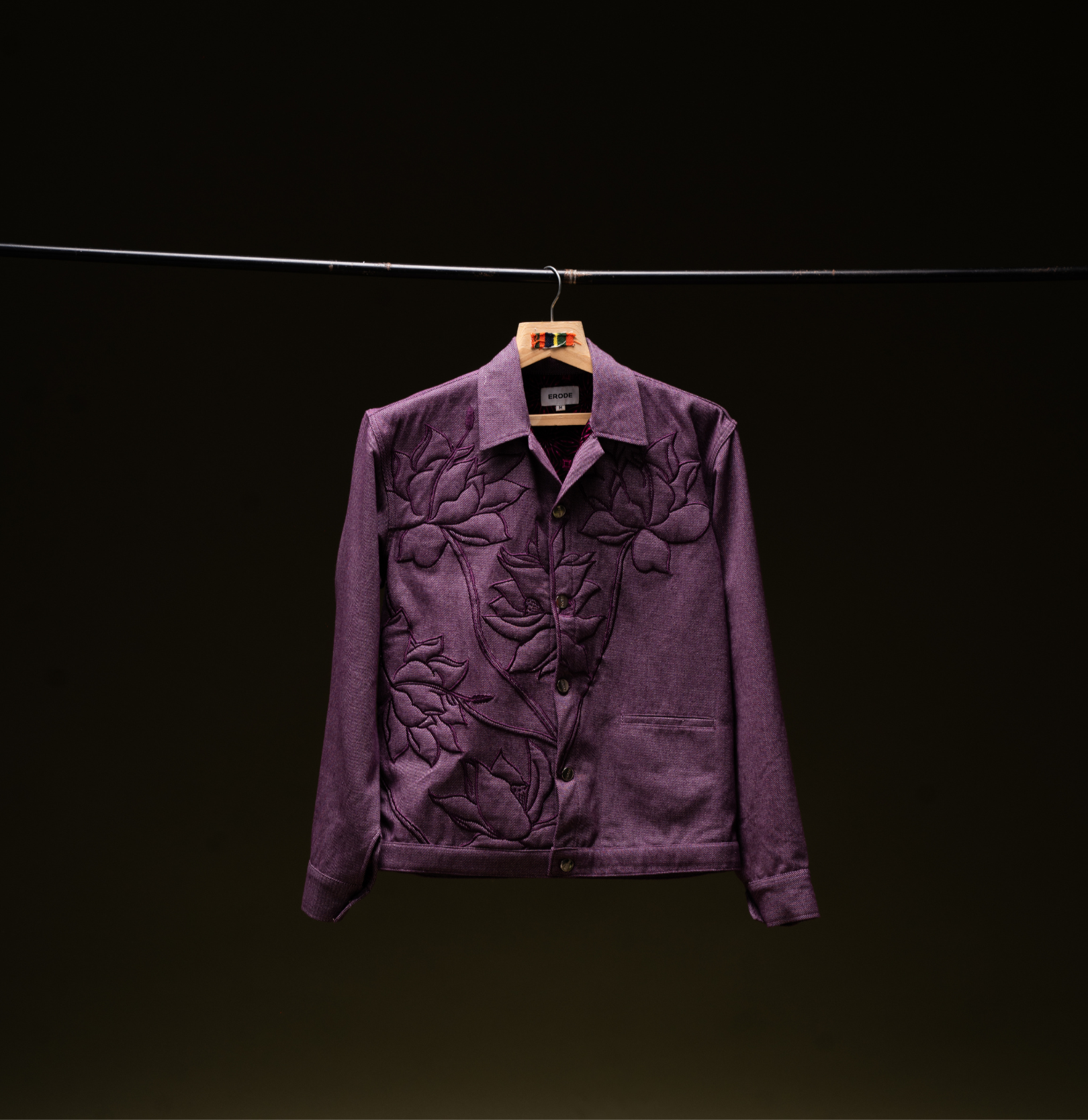 Don't Go Away is Erode's Purple Jamakaalam jacket with floral embroidery. Finished with authentic details like front welt pockets and metal buttons throughout.