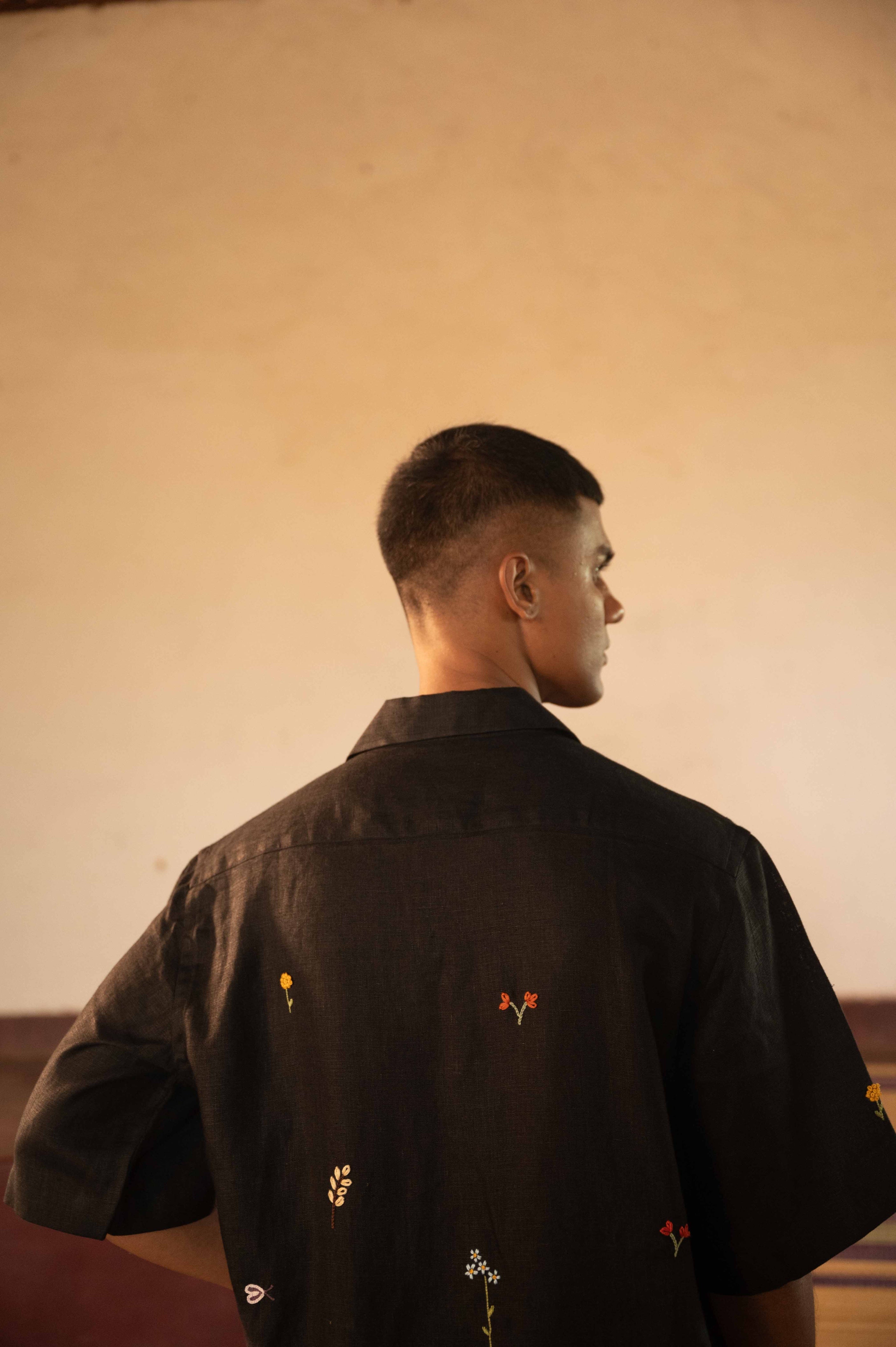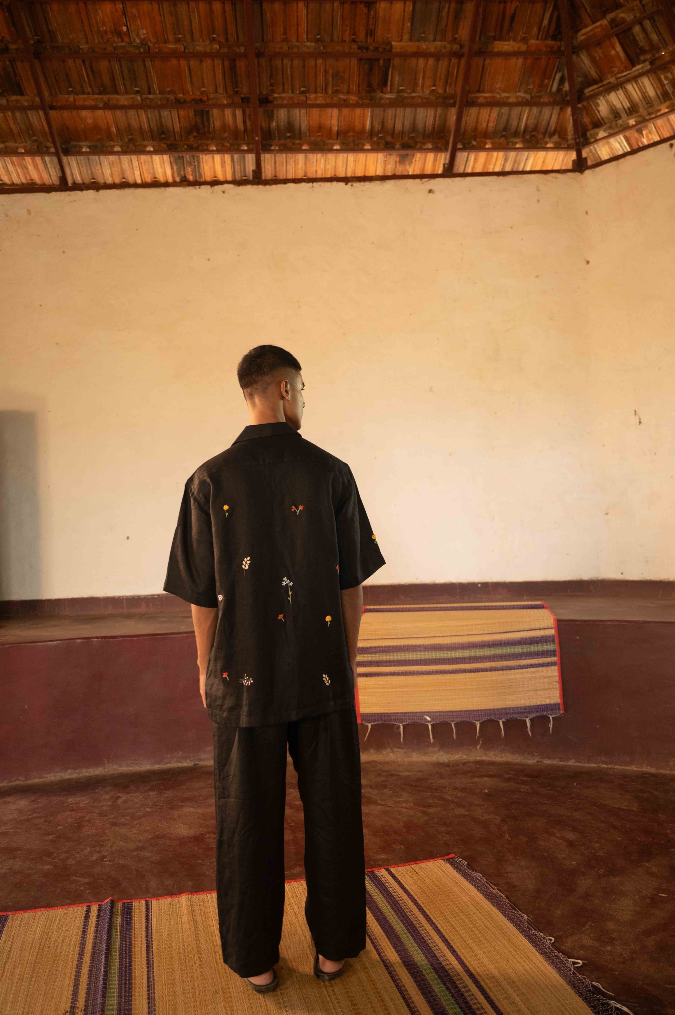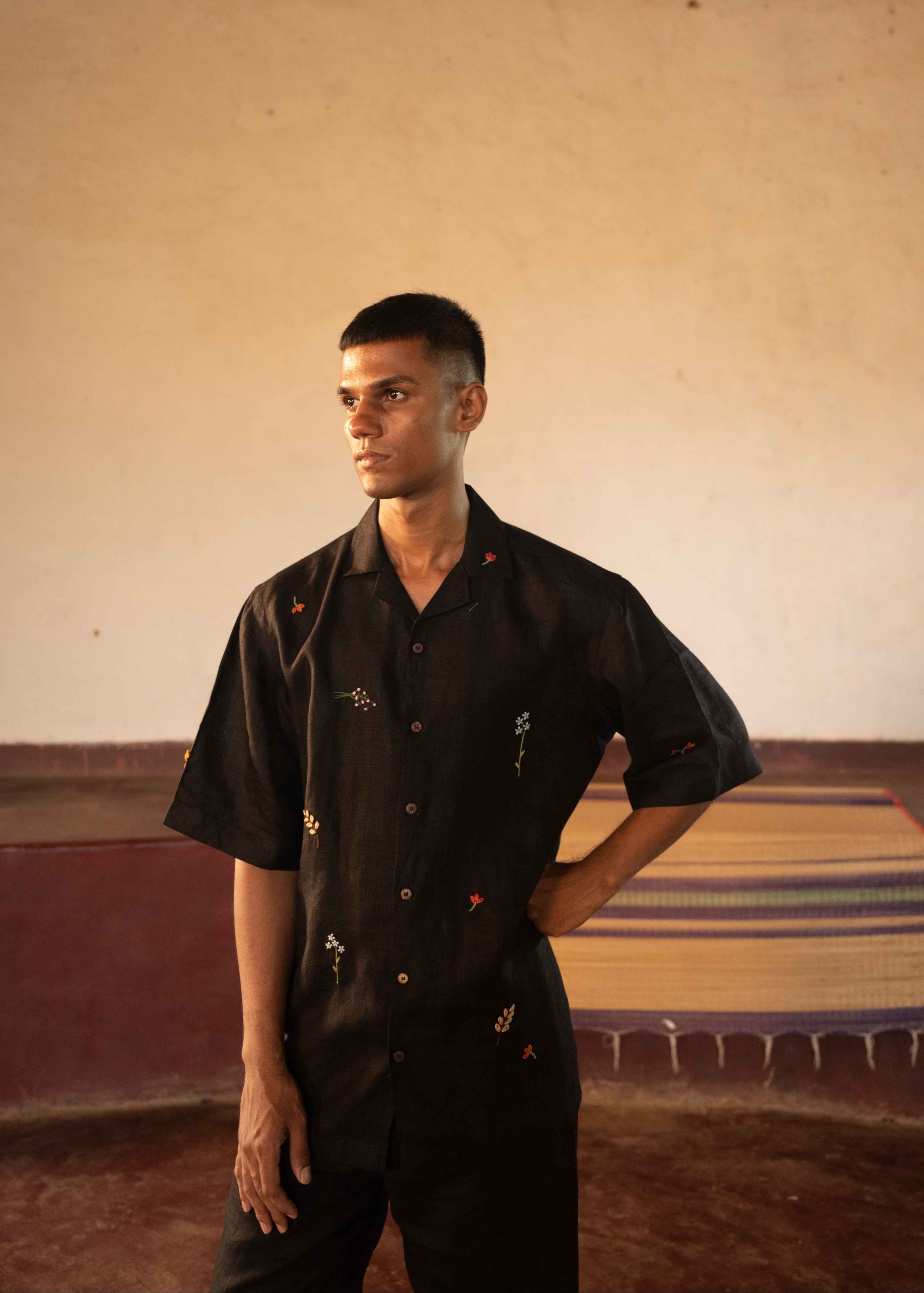 A canvas of black, adorned with scattered flower stalks that grow in no particular order. A shirt that celebrates the beauty of untamed nature—each stitch a sprig, each sprig a story. Pair with linen or cotton trousers or lounge pants