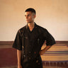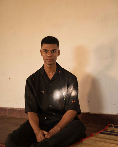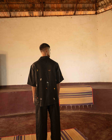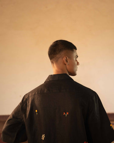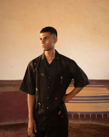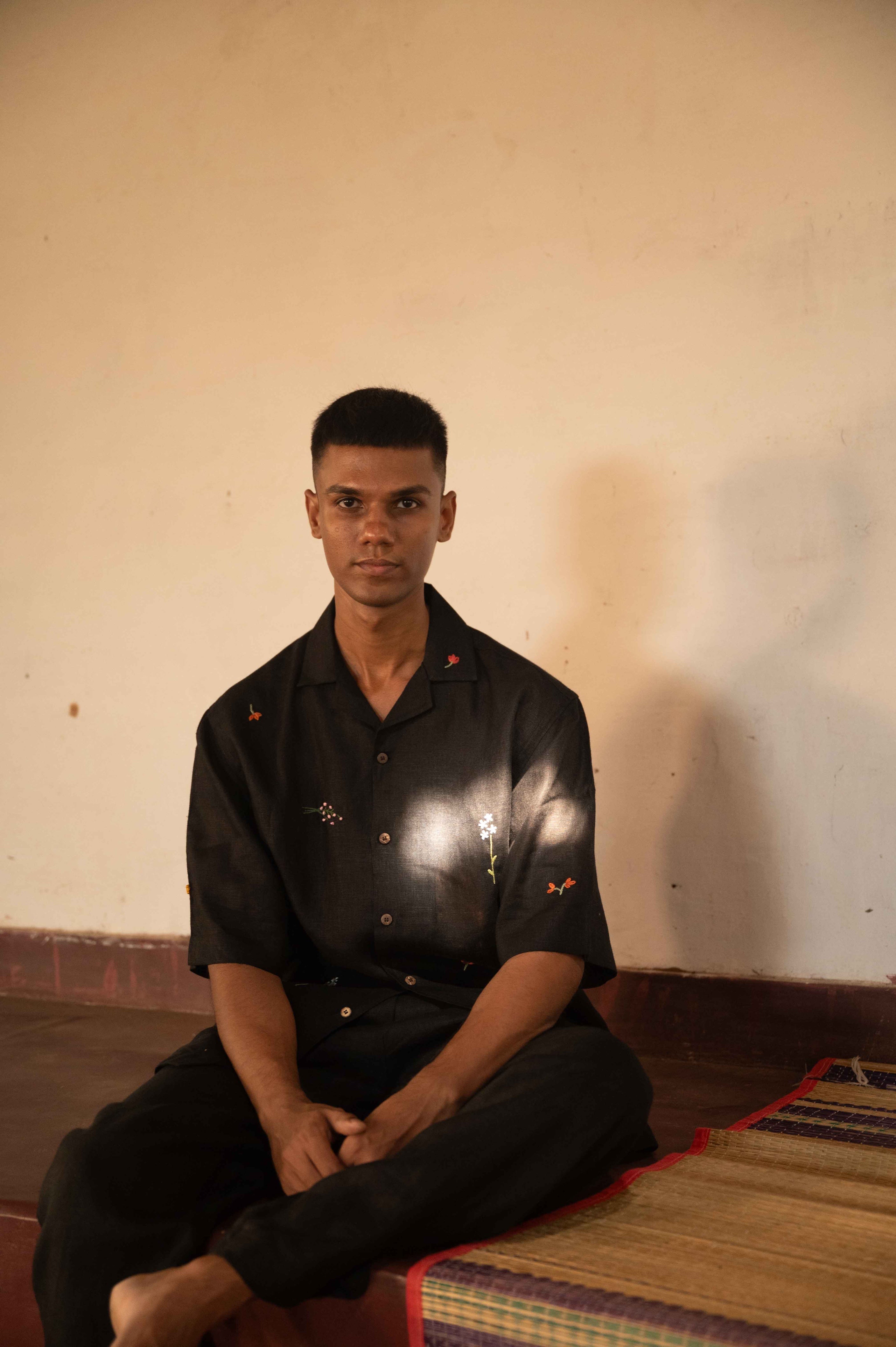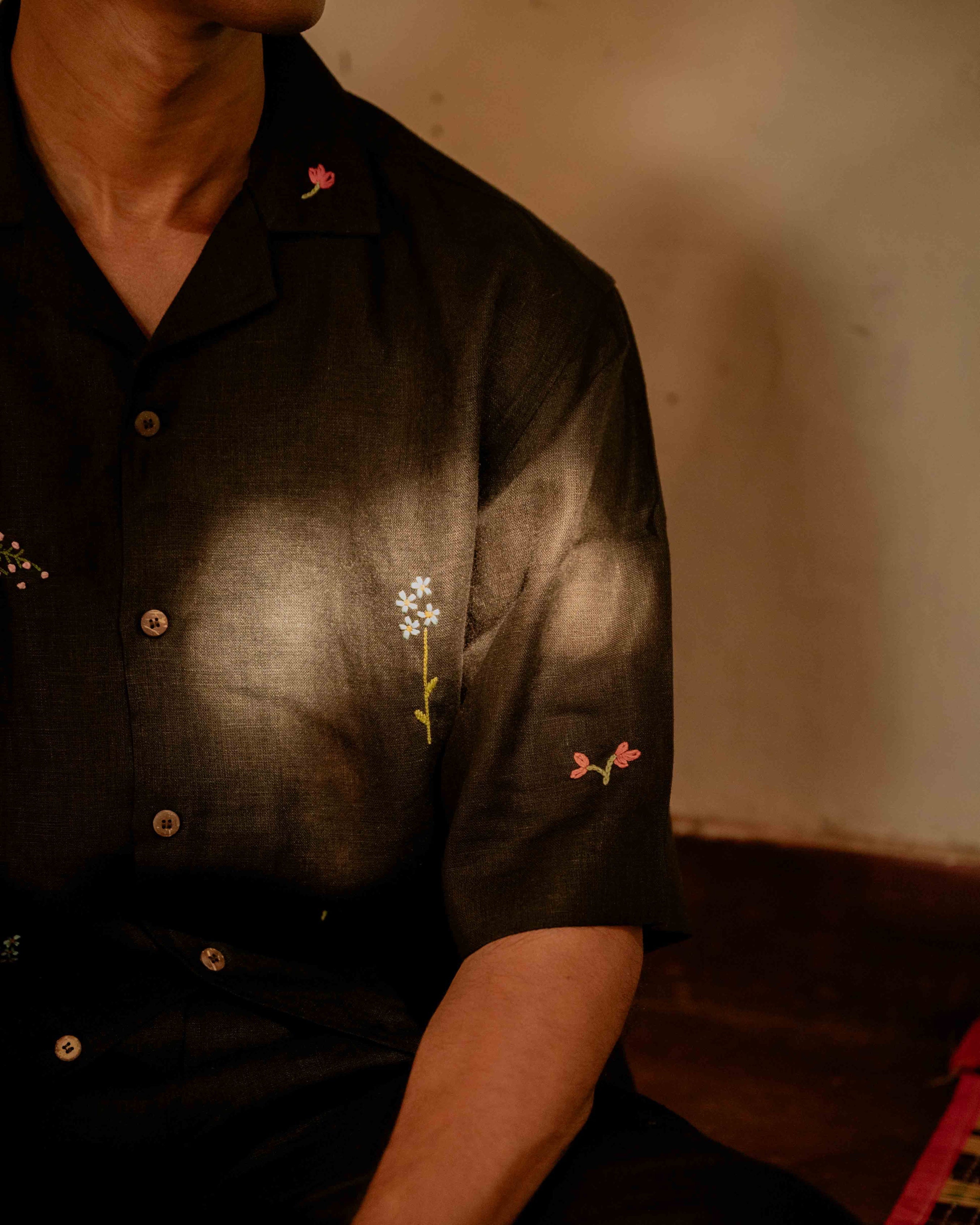 A canvas of black, adorned with scattered flower stalks that grow in no particular order. A shirt that celebrates the beauty of untamed nature—each stitch a sprig, each sprig a story. Pair with linen or cotton trousers or lounge pants