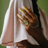 Featuring adjustable bands and a delicate rope chain, it adds an element of drama to your gestures, reminiscent of dancers expressing themselves with their hands, through narrative mudras. The ring's design is a harmonious blend of contrasting elements— the radiant sun and the serene moon—each adorned with undulations, ridges, and three defining dots.