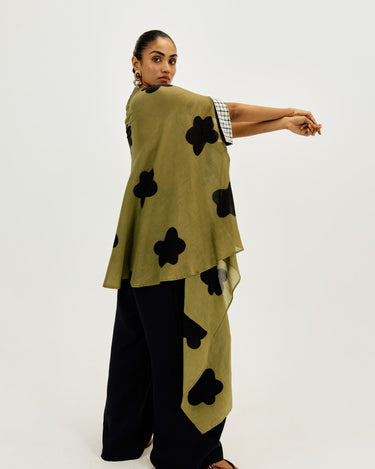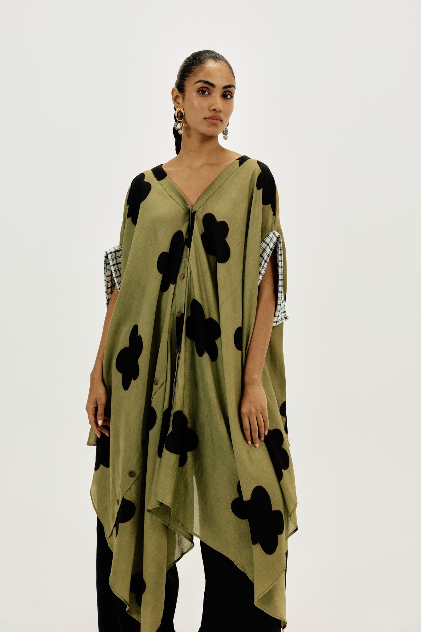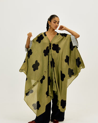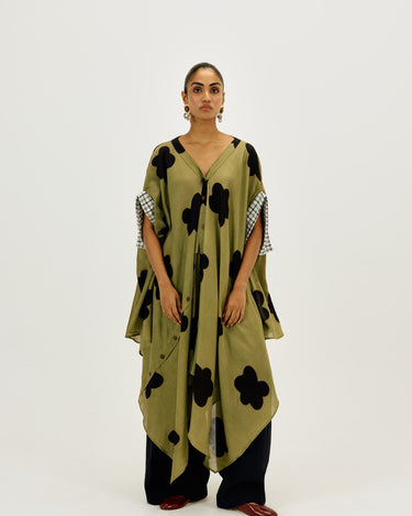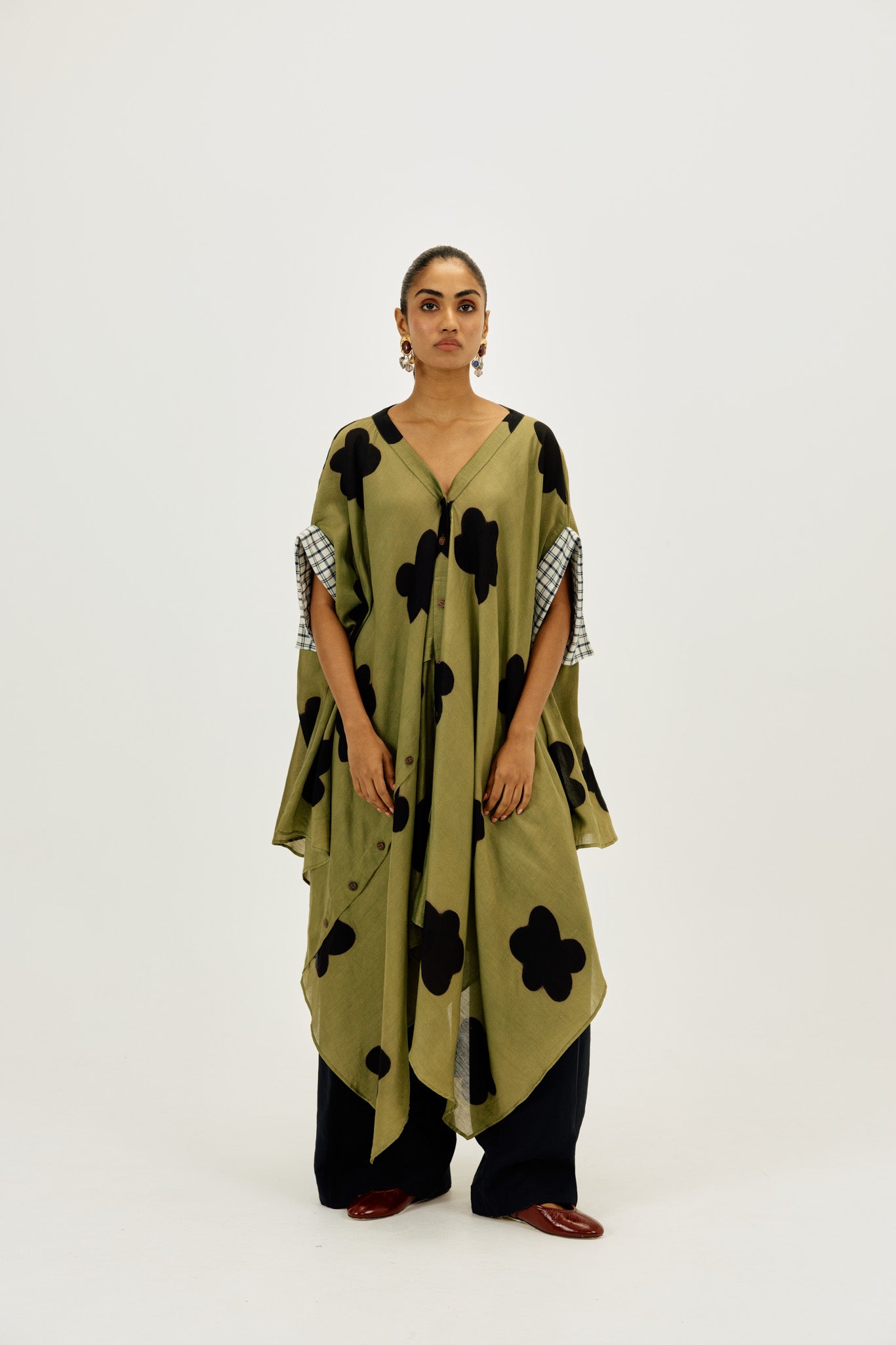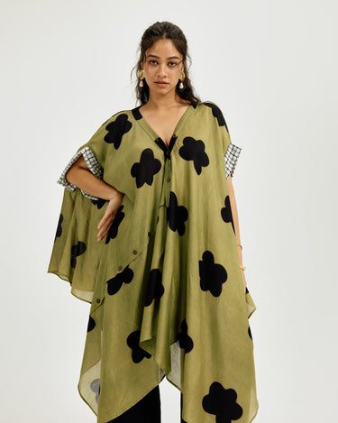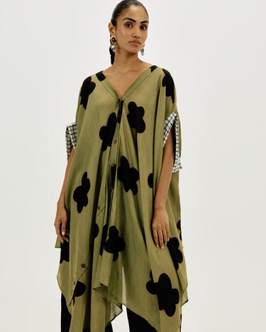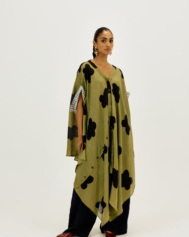 A silhouette that’s fluid, versatile, and effortlessly striking. Crafted in airy, clamp-dyed Chanderi, this asymmetrical kaftan dress drapes with ease—wear it solo or layer it over trousers for a modern take. Turn-up cuffs reveal a contrast check fabric, adding a playful pop of pattern.