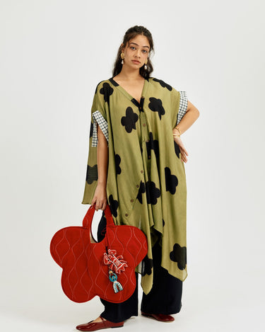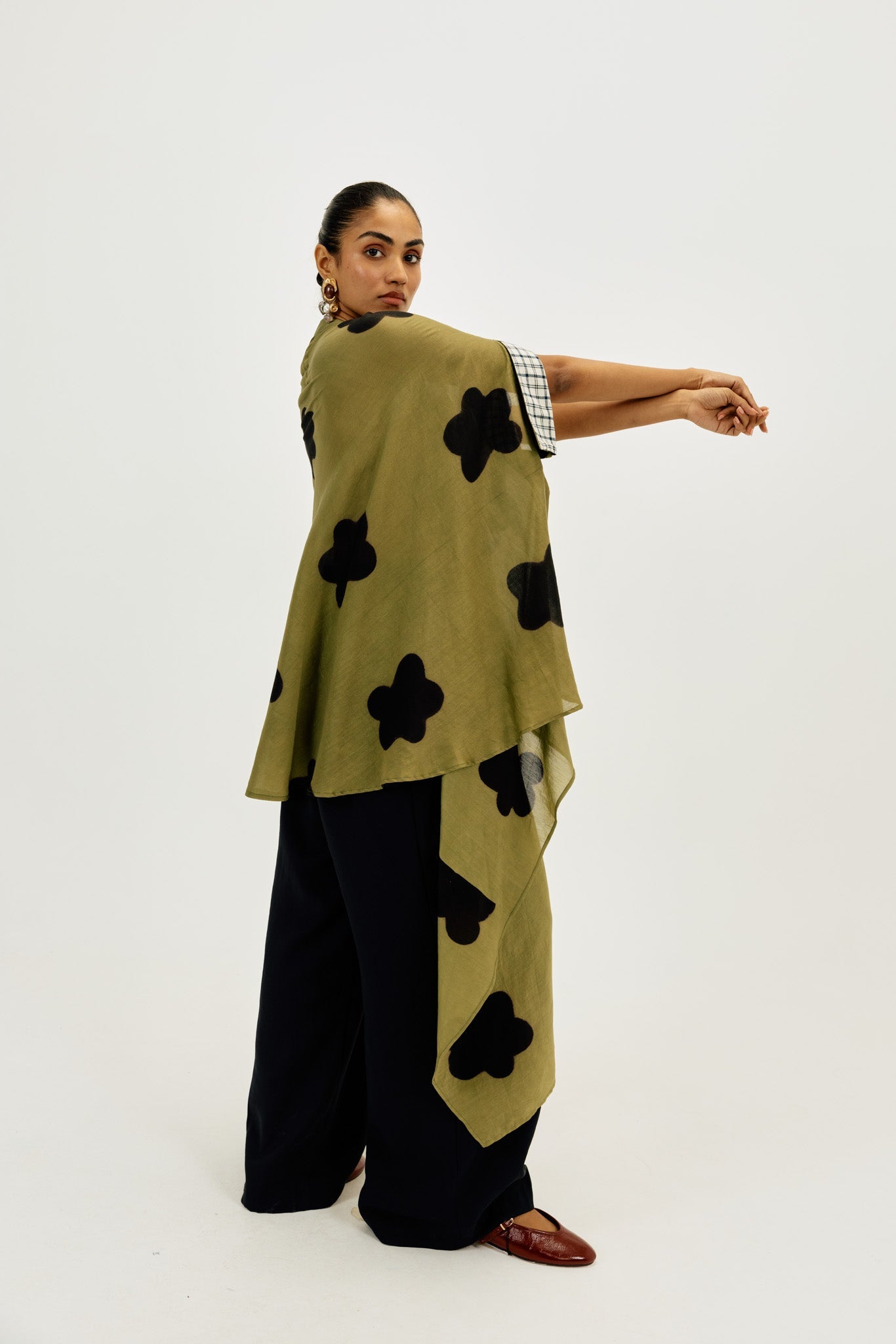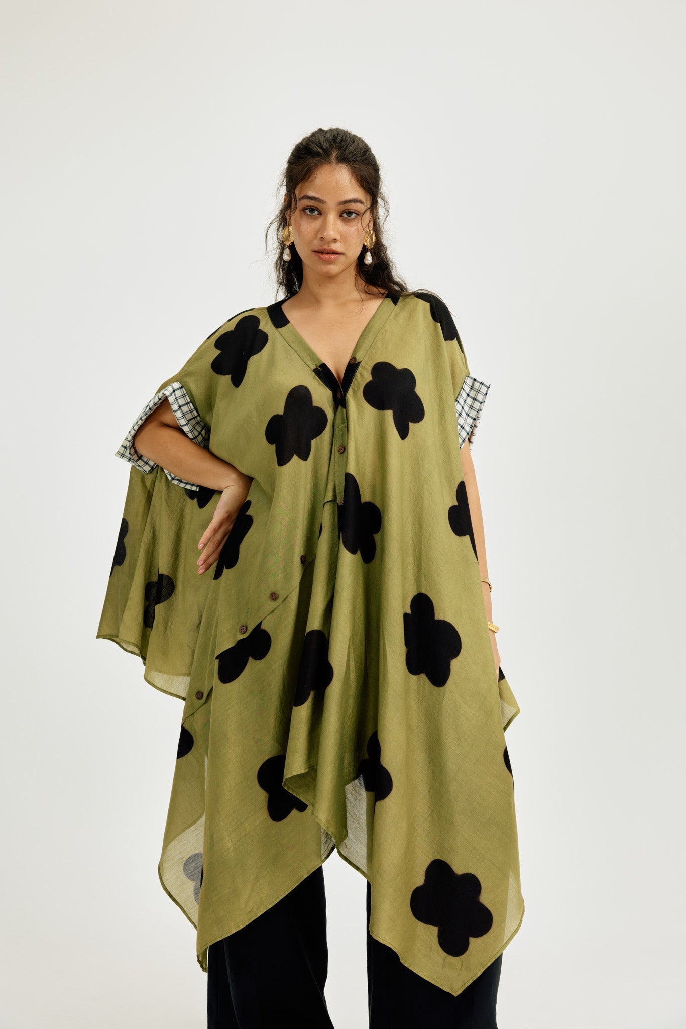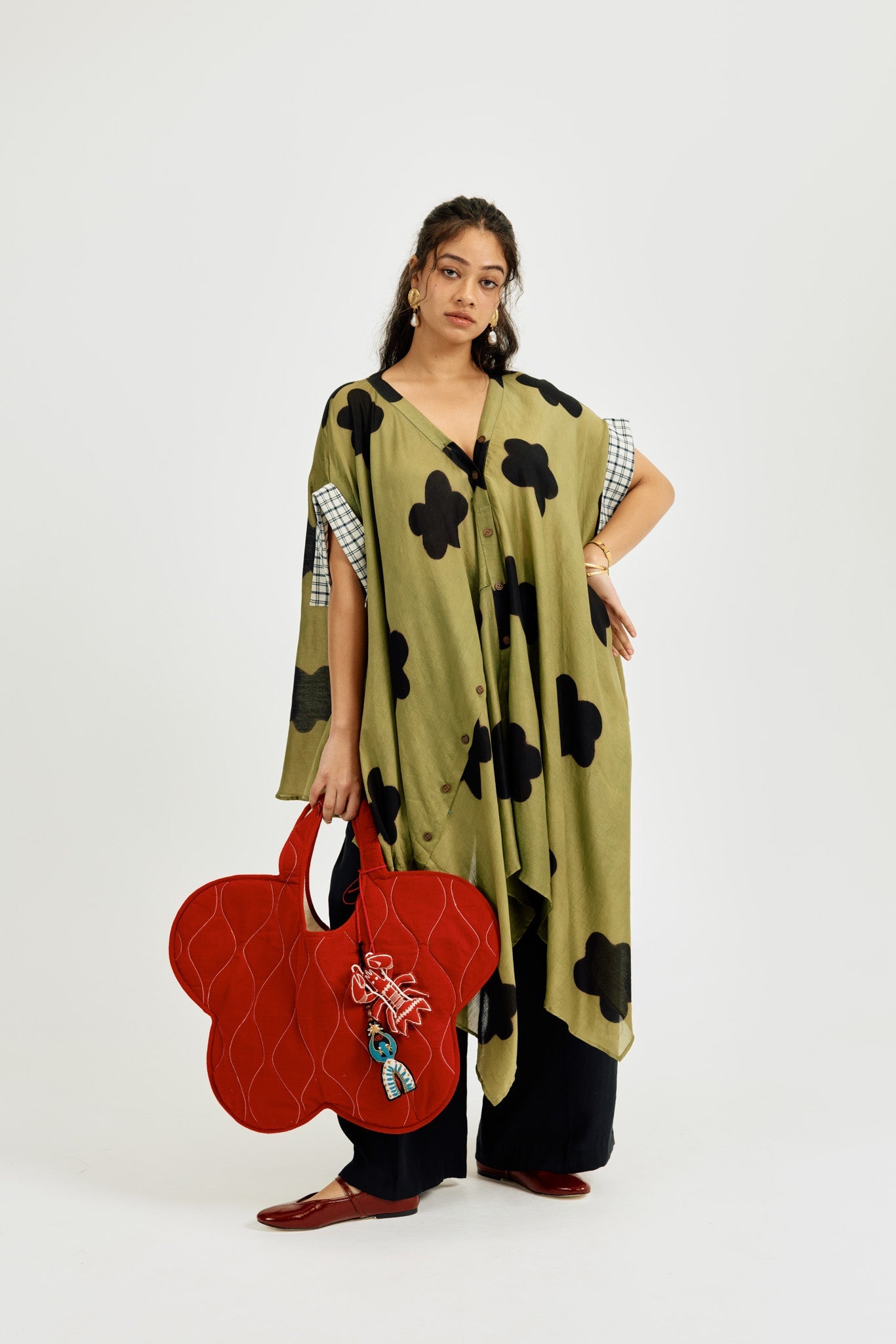 A silhouette that’s fluid, versatile, and effortlessly striking. Crafted in airy, clamp-dyed Chanderi, this asymmetrical kaftan dress drapes with ease—wear it solo or layer it over trousers for a modern take. Turn-up cuffs reveal a contrast check fabric, adding a playful pop of pattern.
