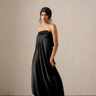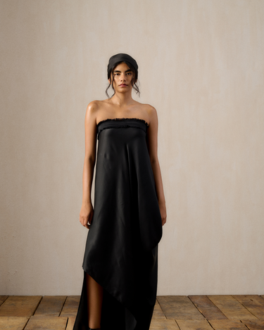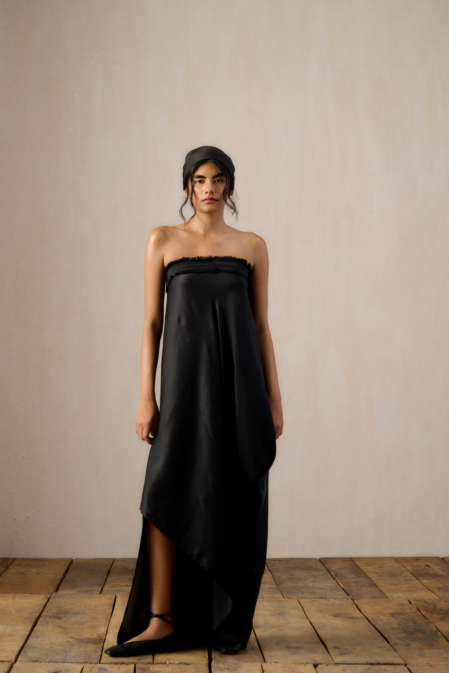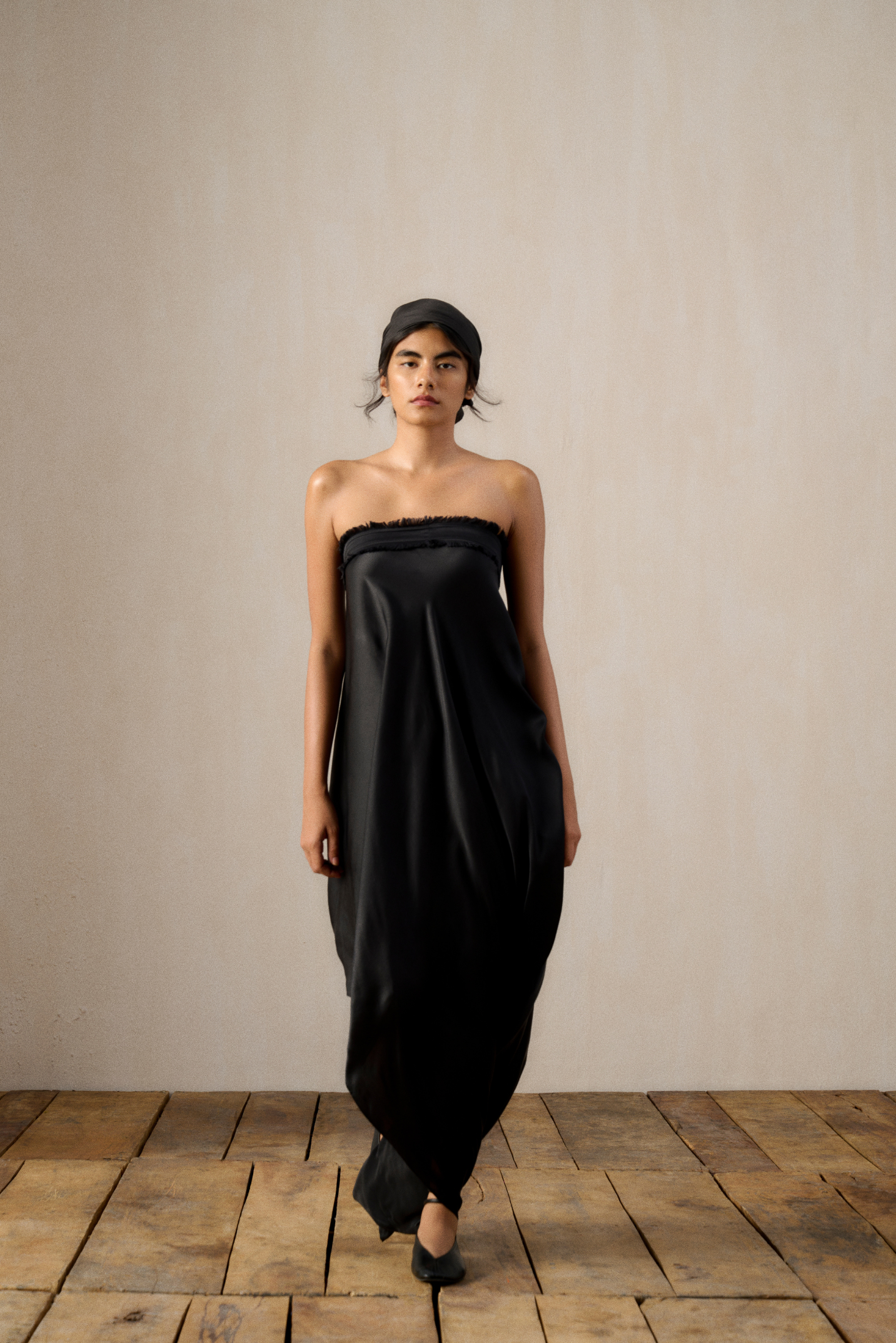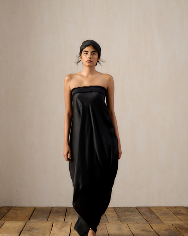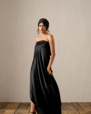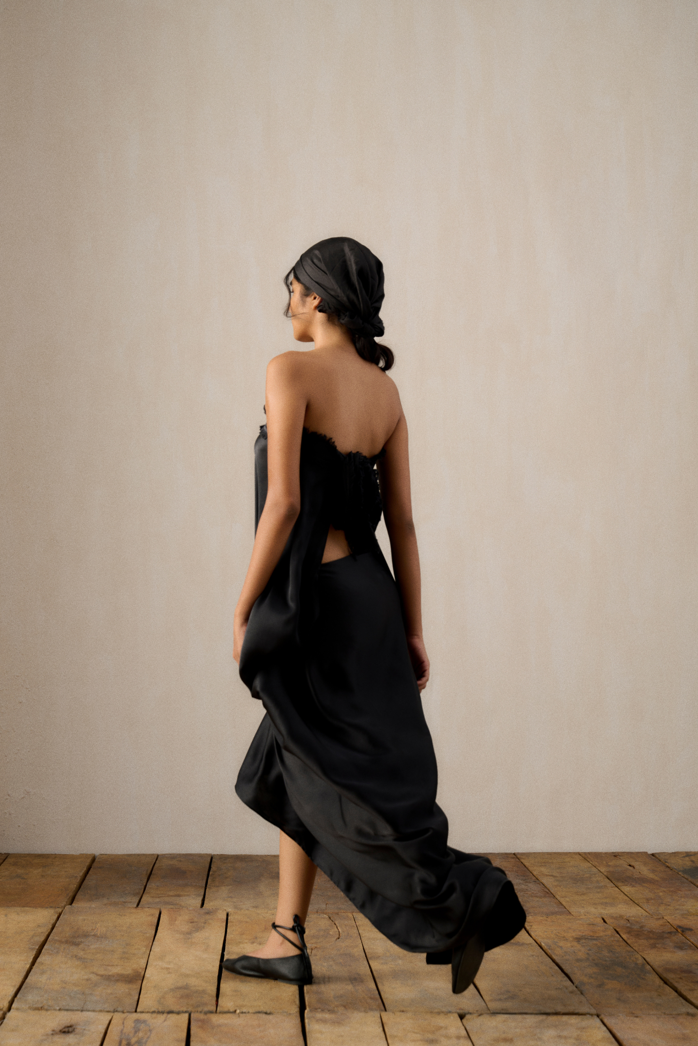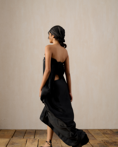 Effortlessly sensual and endlessly versatile, this silk satin dress is designed to drape in multiple ways, accentuating the body with quiet elegance. Its fluid silhouette, delicate ties, and backless form make it a perfect choice for occasion wear.