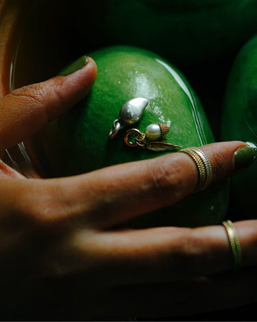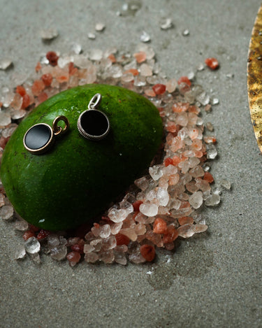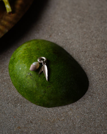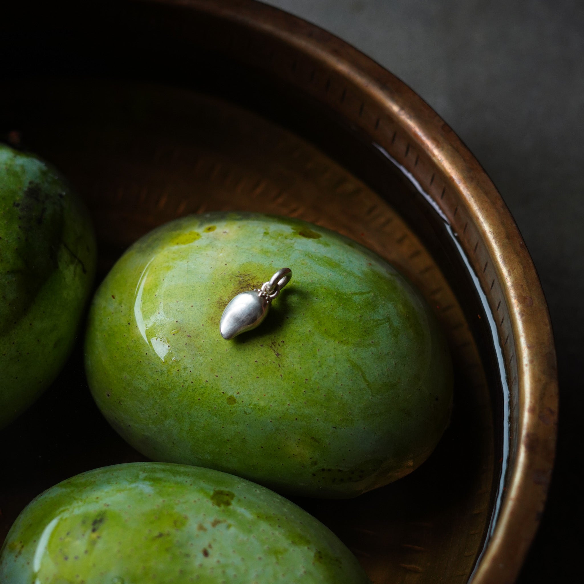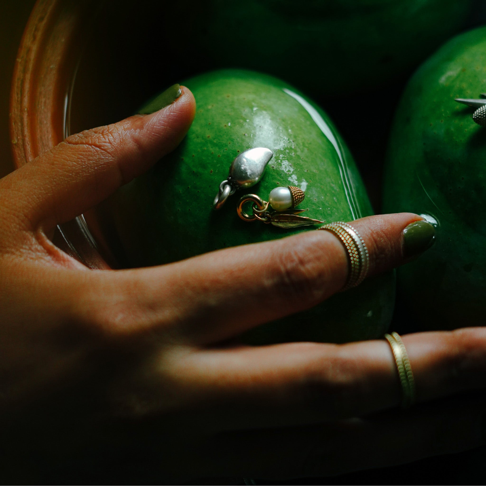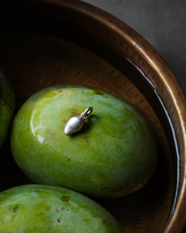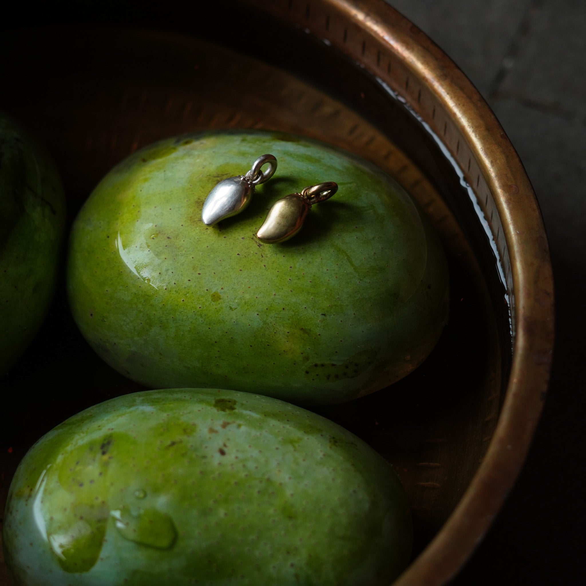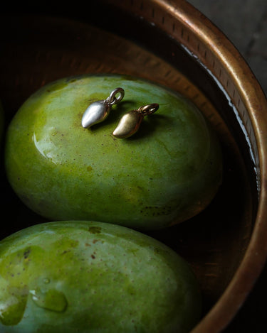 Carry your love and fondness for mangoes close to your heart with this charming collection. Whether it's the delightful heft and intricate granulation of the sculpted mango charm, the protective and grounding properties of the black onyx charm, or the lustrous fresh water pearl mango with dainty dangling leaves, each design is crafted to bring a smile to your face.