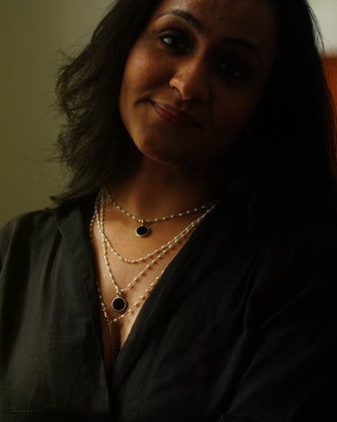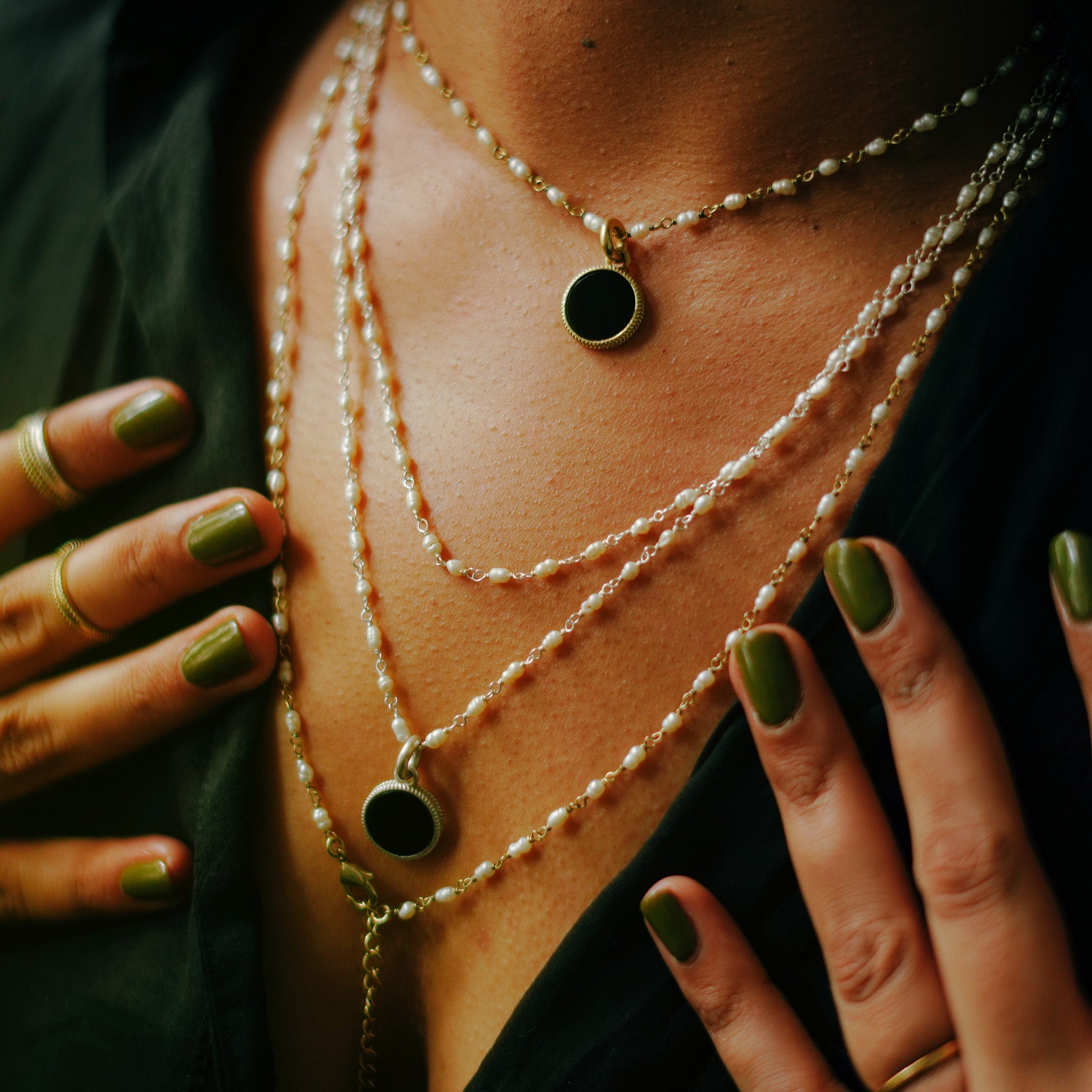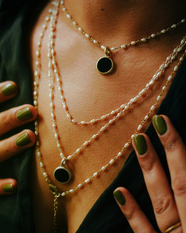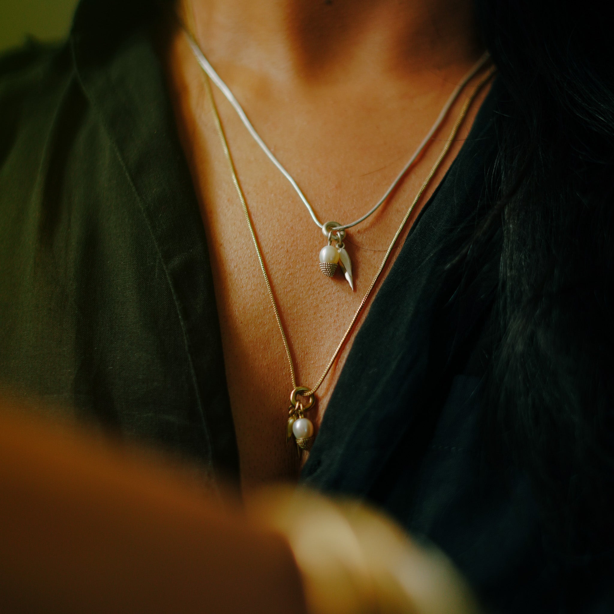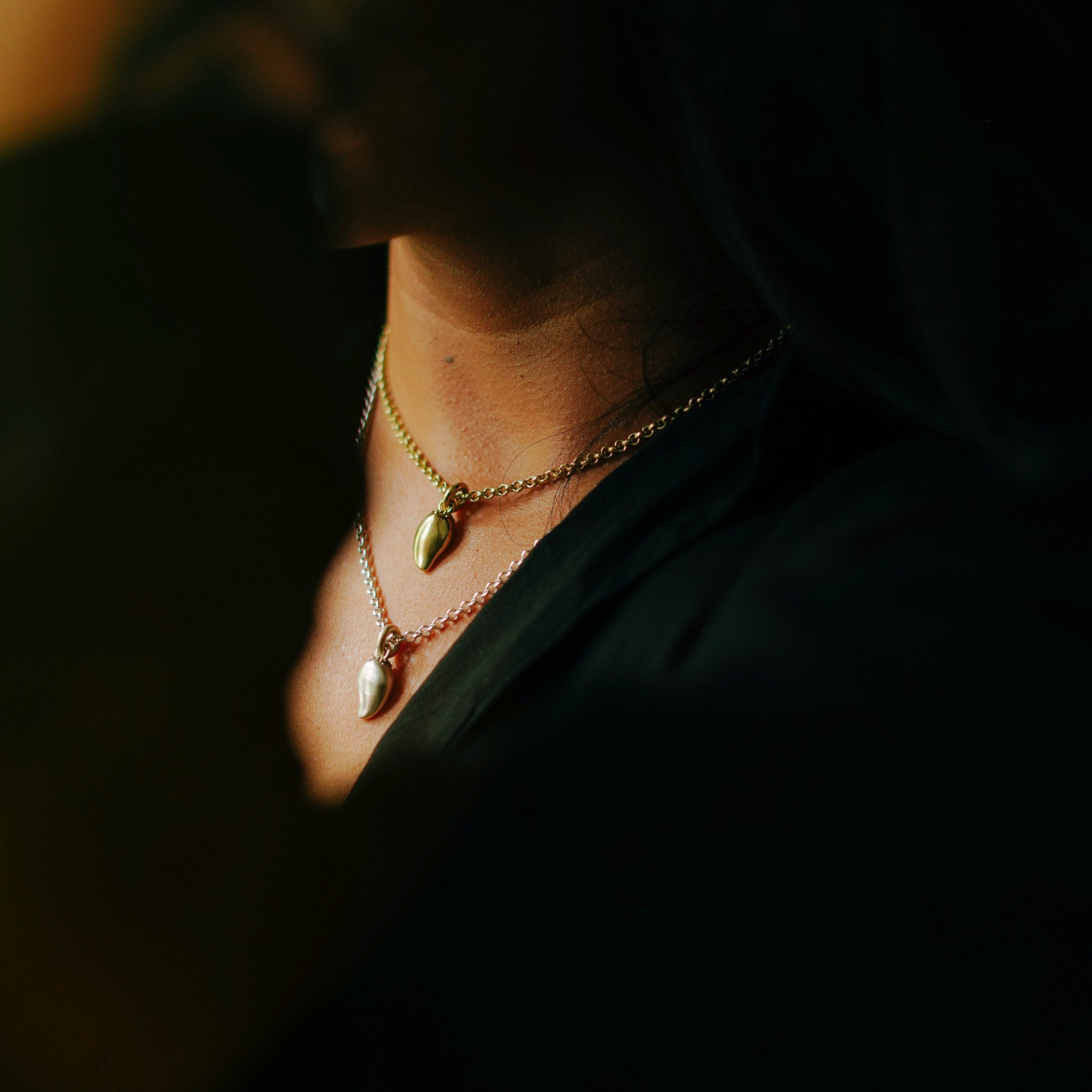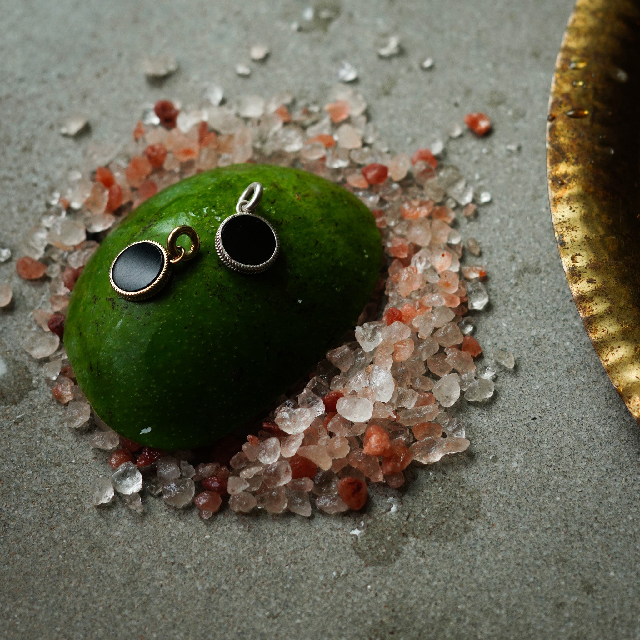 Carry your love and fondness for mangoes close to your heart with this charming collection. Whether it's the delightful heft and intricate granulation of the sculpted mango charm, the protective and grounding properties of the black onyx charm, or the lustrous fresh water pearl mango with dainty dangling leaves, each design is crafted to bring a smile to your face.
