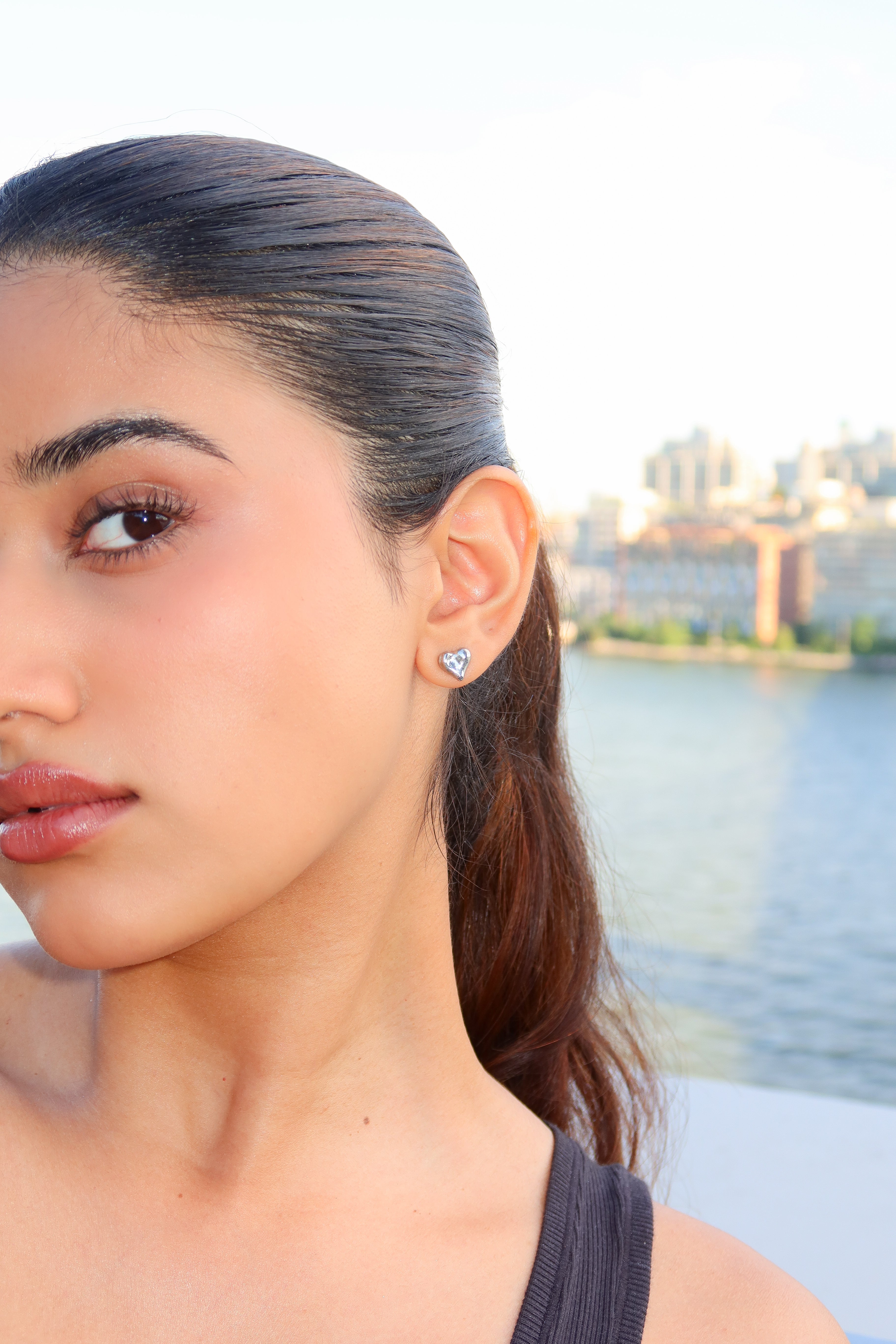 The Mini Heart Stud Earrings, a subtle piece which speaks gently of love. Handcrafted in 925 sterling silver and perfect for everyday wear, solo or layered.