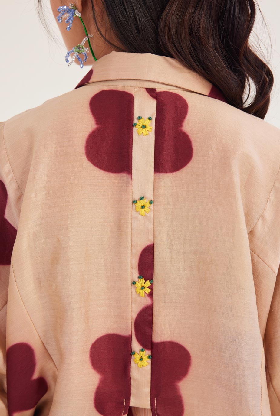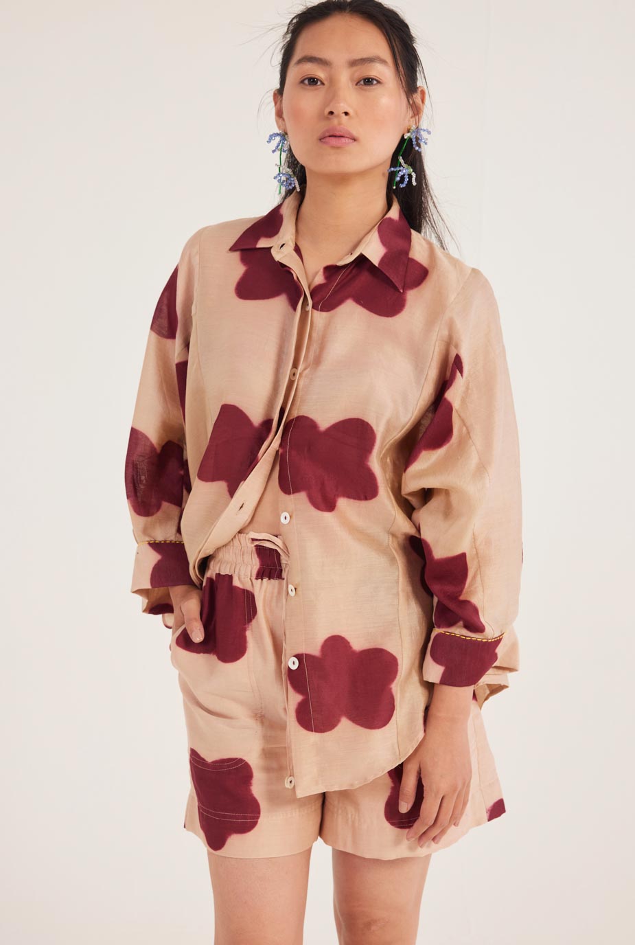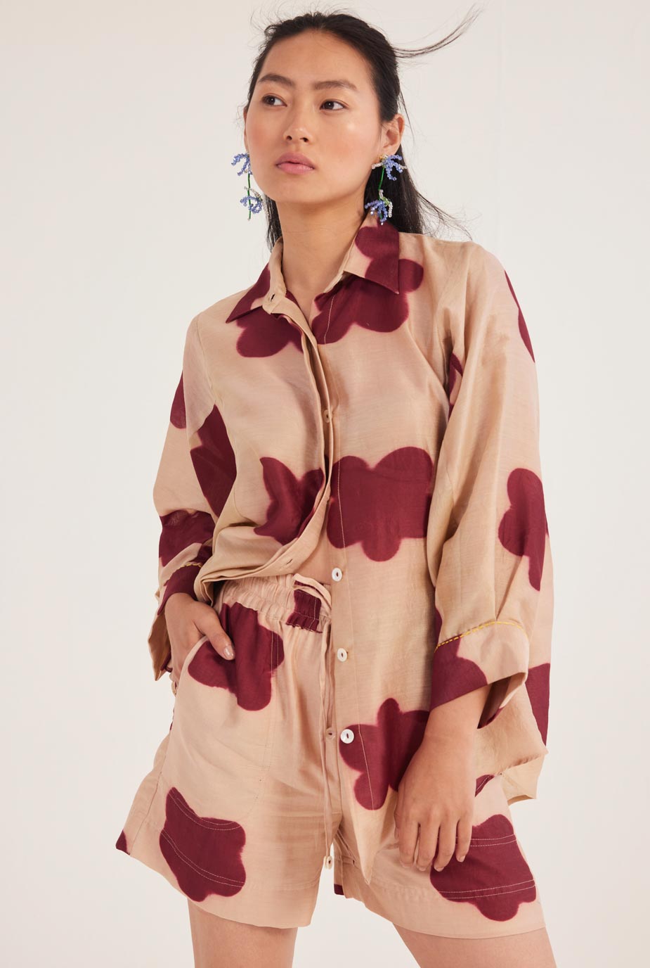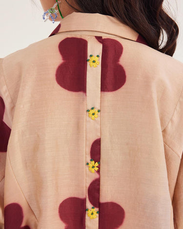 The slouchy, slightly oversized fit of this clamp dyed muslin-silk-shirt feels effortlessly chic. Crafted in soft, flowy fabric that feels like second skin, it features an asymmetric hemline and an interesting back detail with hand embroidered details you can’t miss.