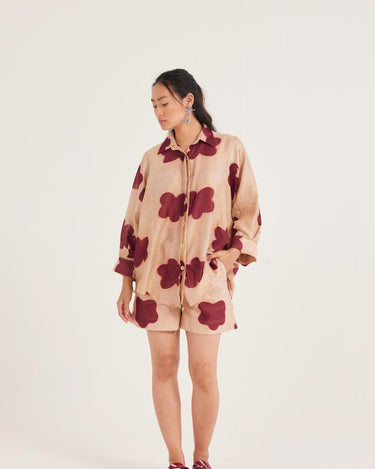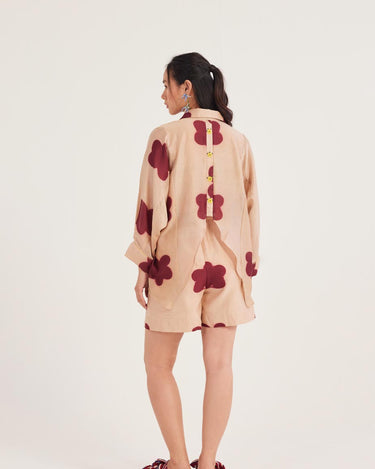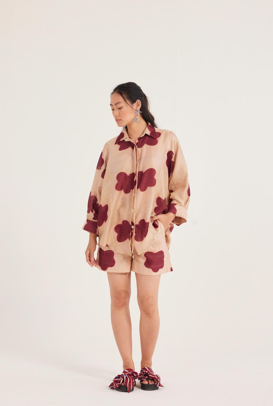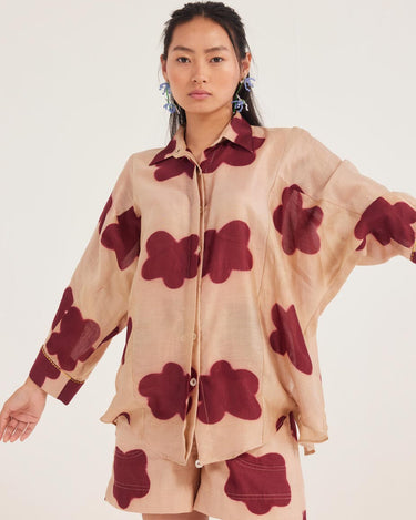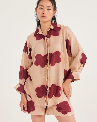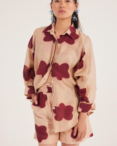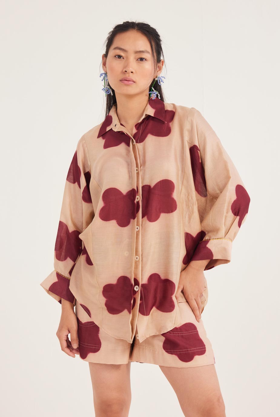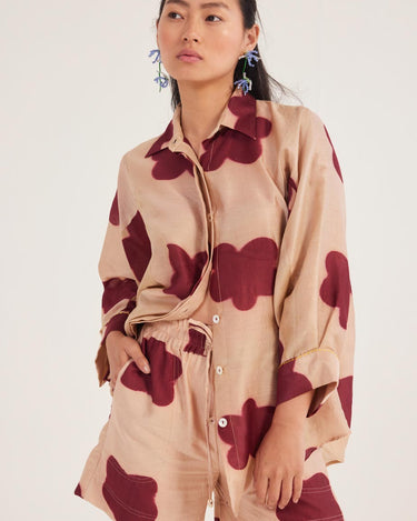 The slouchy, slightly oversized fit of this clamp dyed muslin-silk-shirt feels effortlessly chic. Crafted in soft, flowy fabric that feels like second skin, it features an asymmetric hemline and an interesting back detail with hand embroidered details you can’t miss.