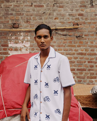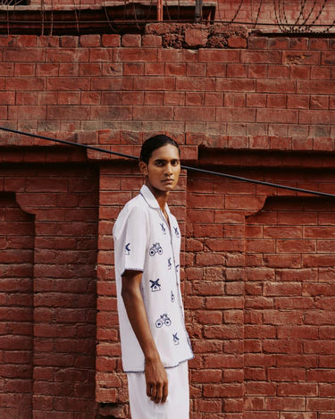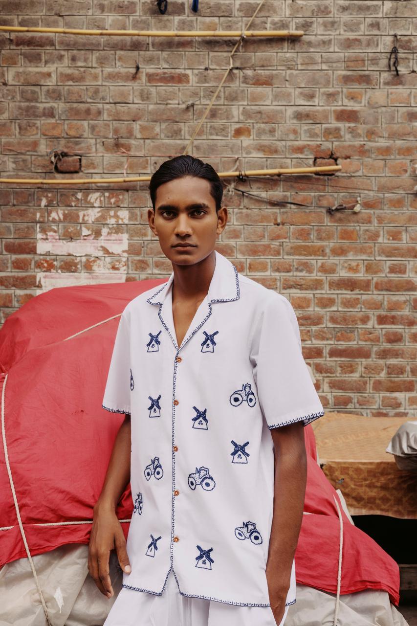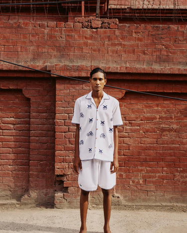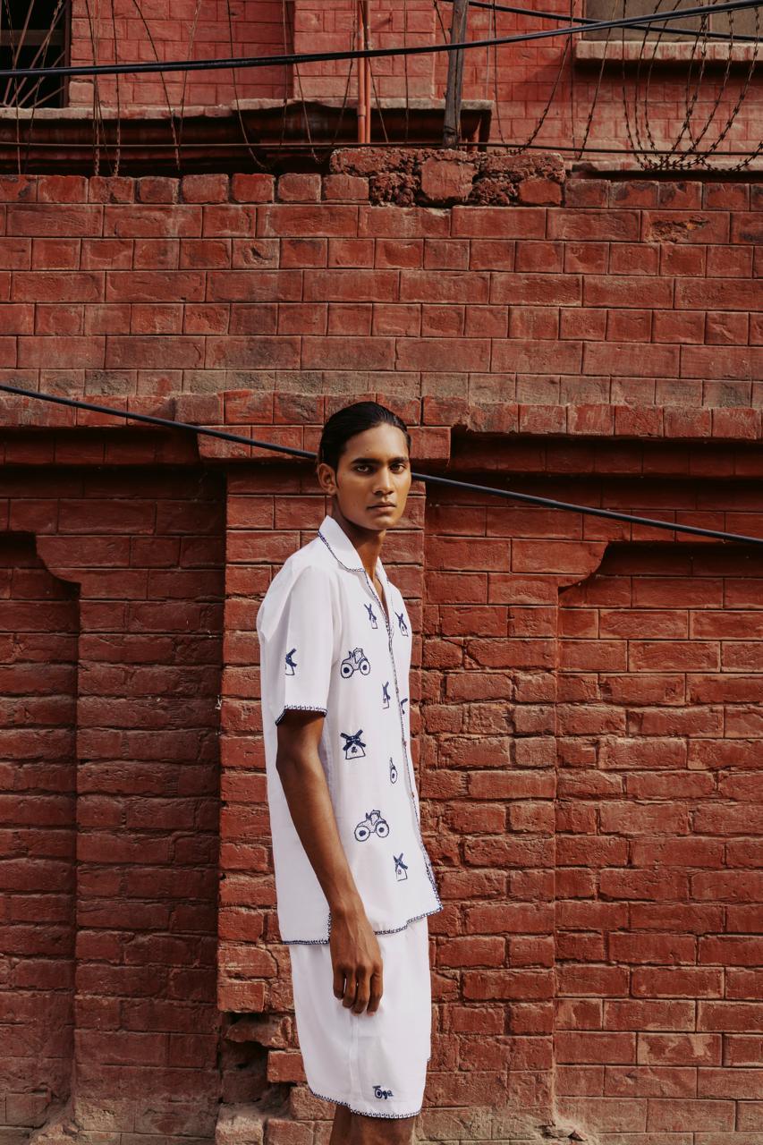 100% organic linen and hand embroidered. Bowler shirt and matching shorts, can be bought individually or as a set.